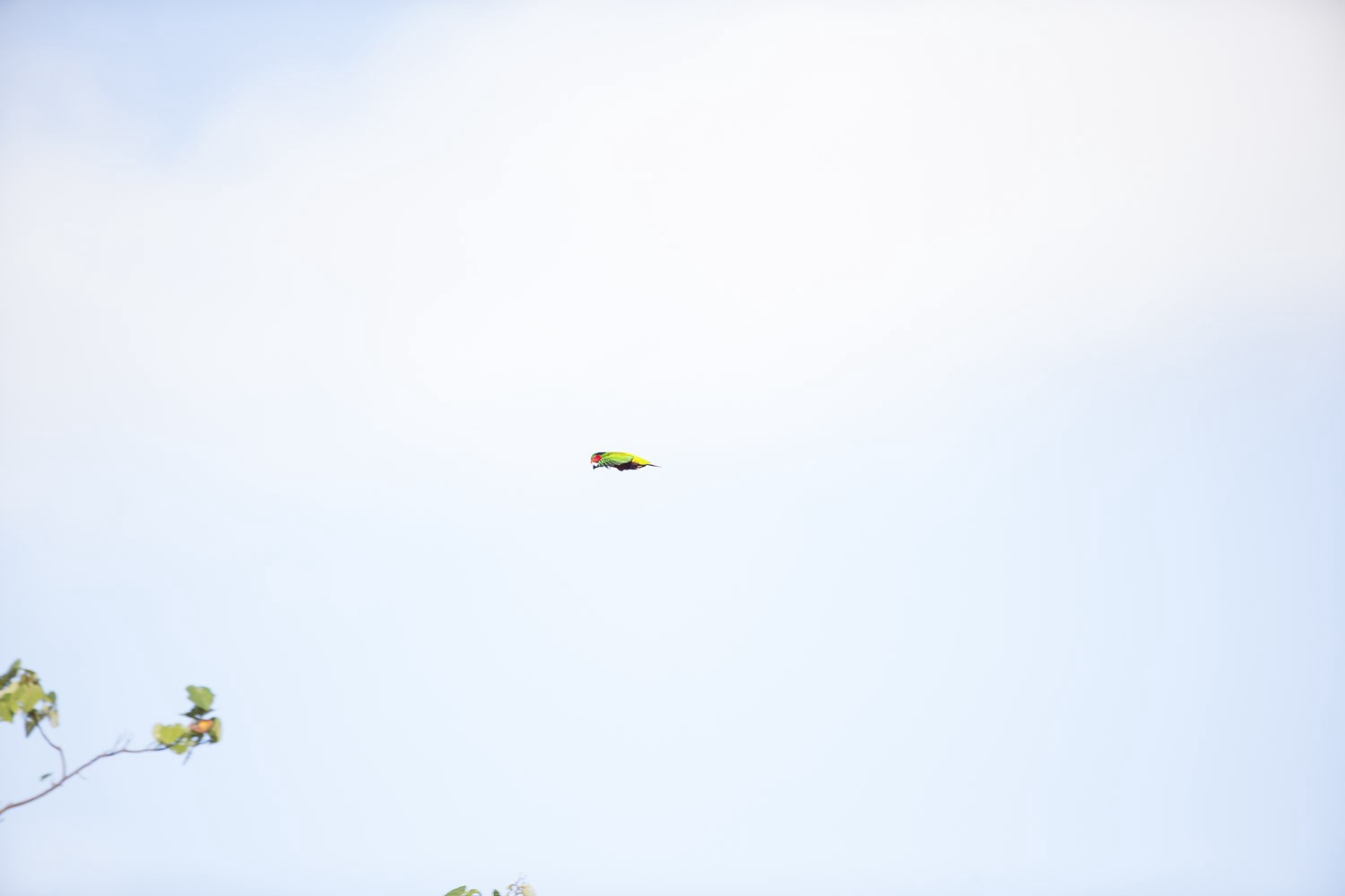 The Kuhl's Lorikeet has a fast and direct flight, accompanied with cries when it flies in a group. Rather gregarious, outside the breeding season, the Kuhl's Lorikeets gather at dusk on a dormitory tree where they spend the night. In the early morning, they fly to eat. During the breeding season, the dormitory is abandoned in favor of nesting sites