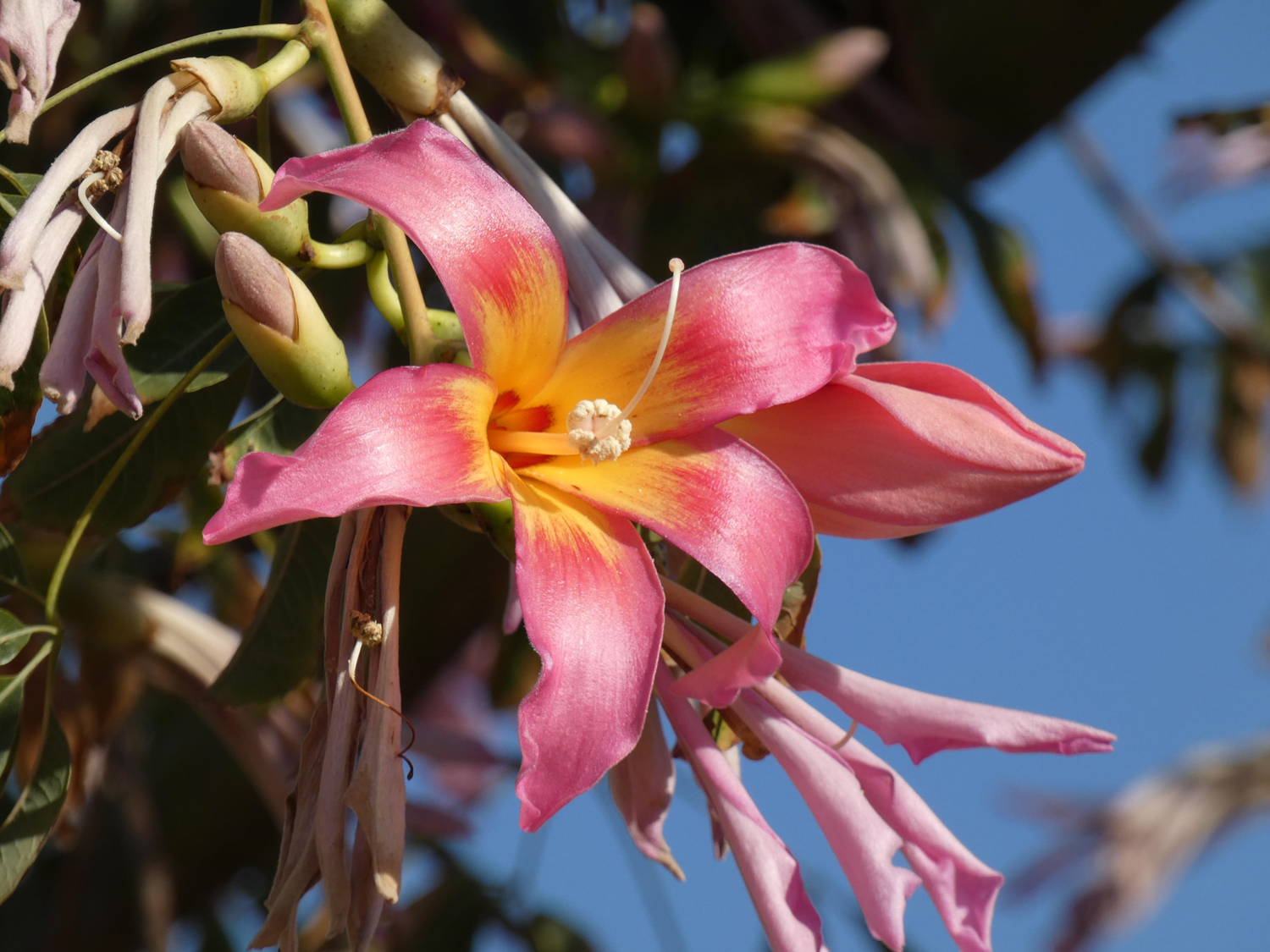 Las ramas tienden a ser horizontales y también están cubiertas de aguijones. Hojas compuestas con cinco a siete folíolos normalmente cerrados. Flores de cinco pétalos con el centro blanco cremoso y rosa en la zona distal, miden 10-15 cm de diámetro y su forma recuerda al hibisco. Su néctar es muy atractivo para los colibríes así como para las mariposas monarca que la polinizan.