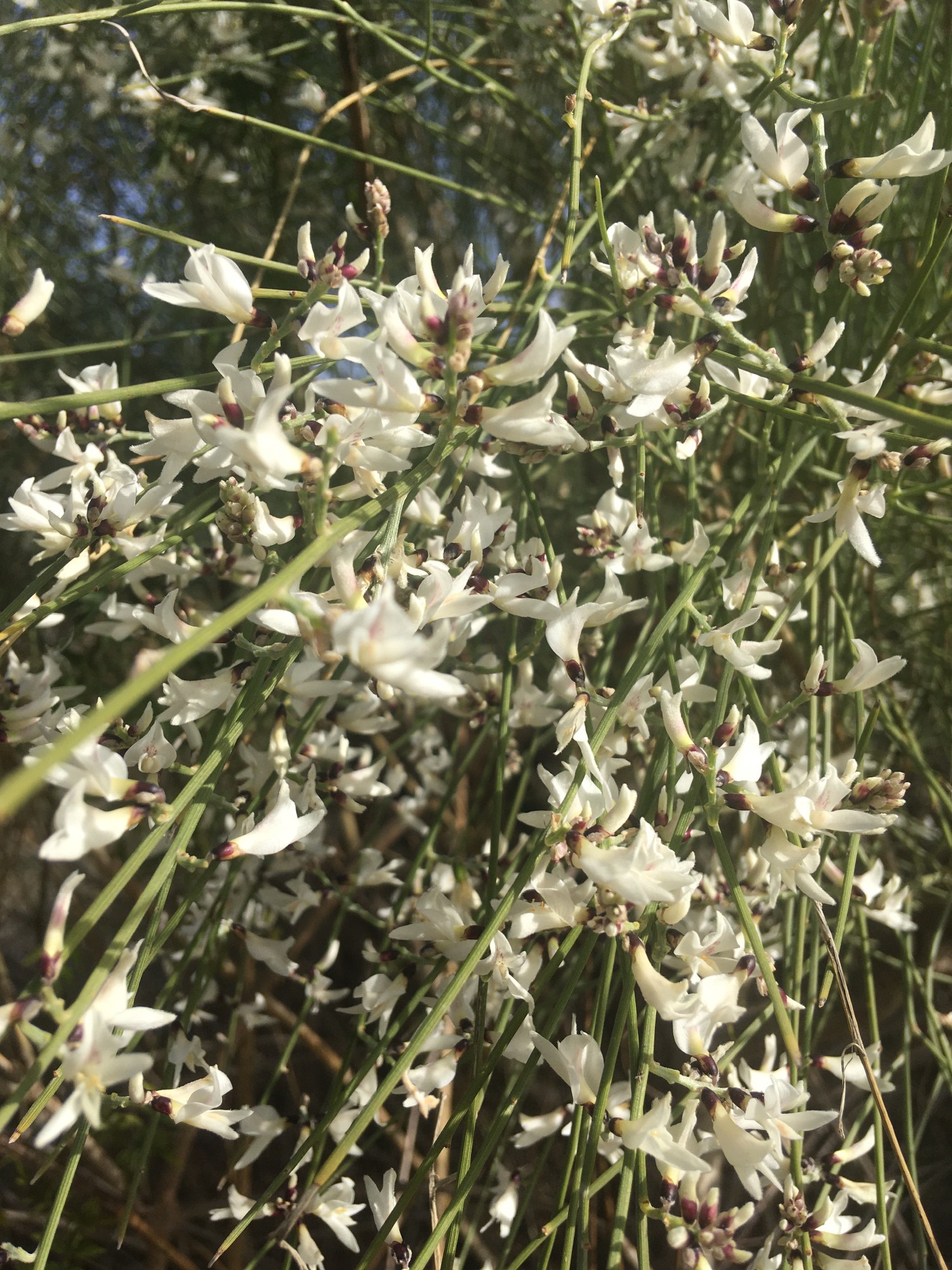 La retama blanca, pertenece a la familia de las leguminosas y es un arbusto monoico, de 1 a 3 m de altura, con ramas junciformes, de color verde, estriadas longitudinalmente. Lo más característico de esta especie son sus llamativas y atractivas flores blancas, las que se presentan amariposadas, de 9-12 mm, dispuestas en racimos laterales cortos y con racimos florales. La floración de este arbusto es muy temprana, de forma que al final del invierno y principios de la primavera, ya podemos encontrarlo en abundante floración, produciendo un olor dulce e intenso. Están formadas por un cáliz tubular de color rojizo, con dientes triangulares; la corola tiene la forma amariposada de las leguminosas, es de color blanco, y tiene un tamaño de alrededor de 1 cm.