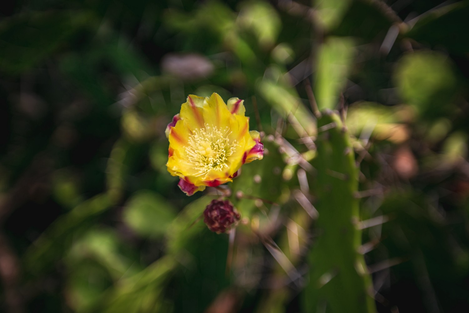 The flowers of the Prickly Pear tree (Opuntia ficus-indica) generally appear on the areolas located at the top of the cladodes or on their sunniest faces. The flowers have orange yellow petals, numerous stamens and a pistil surmounted by a multiple stigma. Each aerola normally gives only one flower.