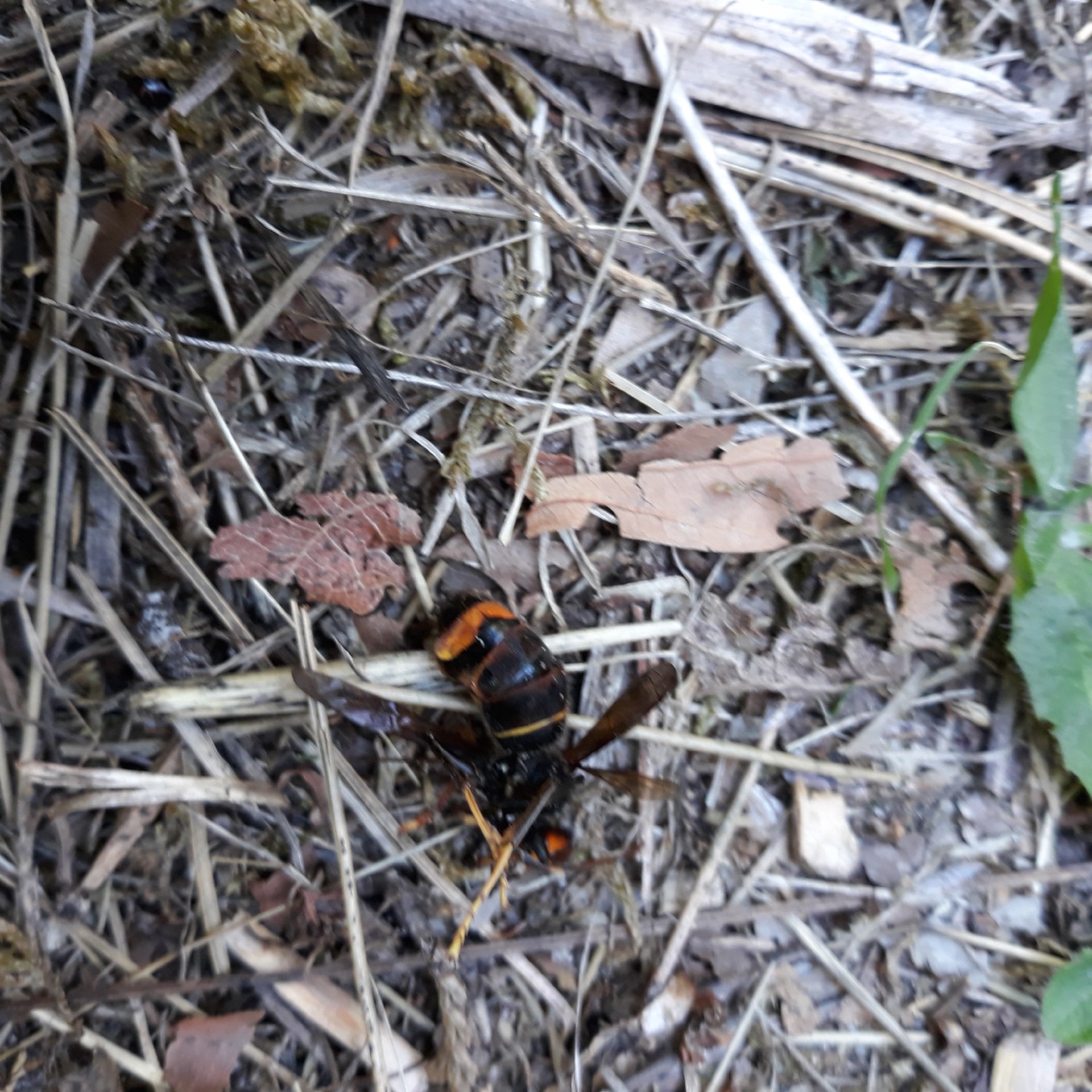 Lors de ma visite aux ruches j'ai tué (avec une raquette de badminton) 8 à 10 frelons asiatiques qui est un des nombreux ennemis des abeilles.