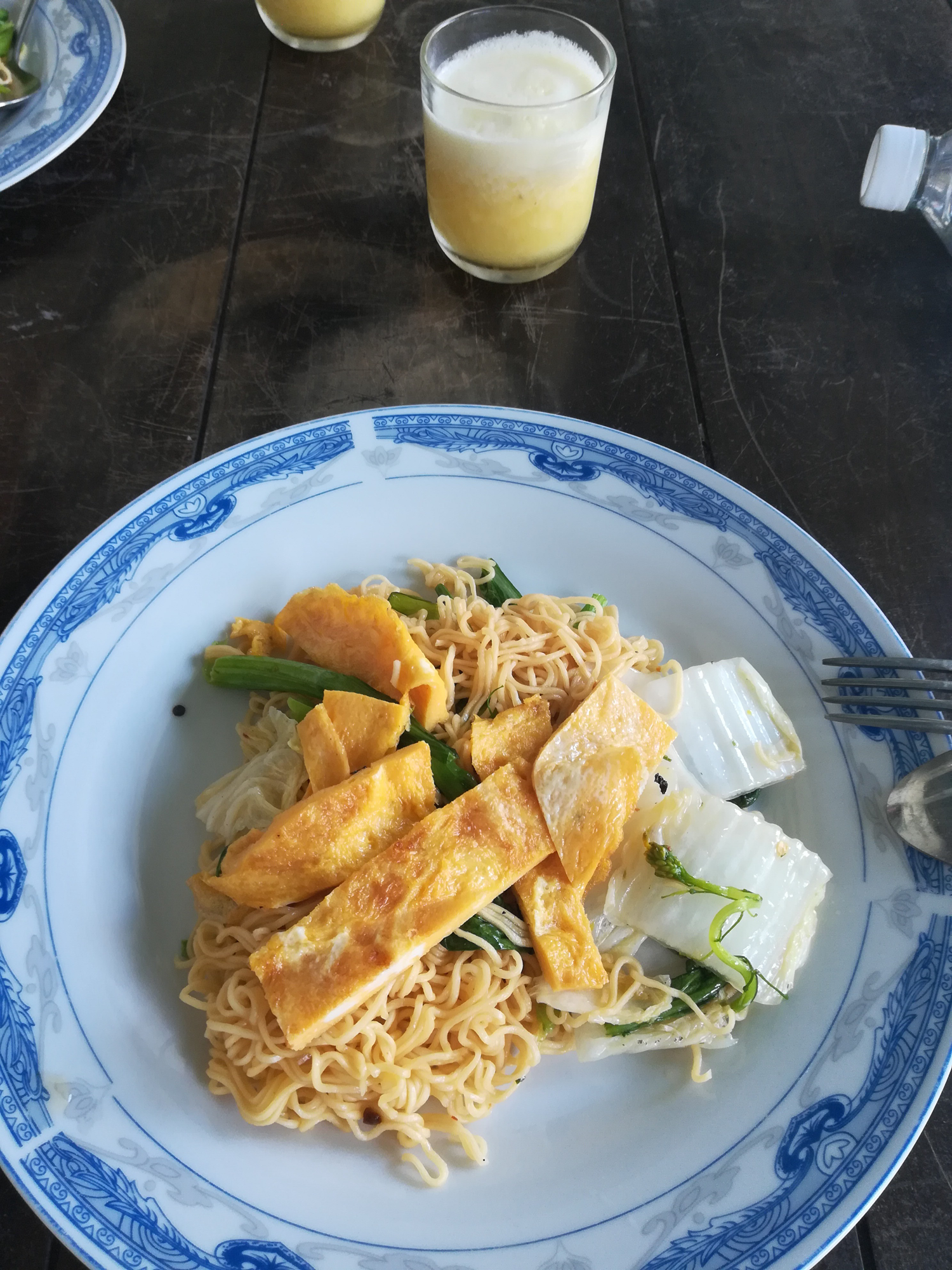 Nouilles sautées aux légumes avec omelette et un mango shake, plat vietnamien