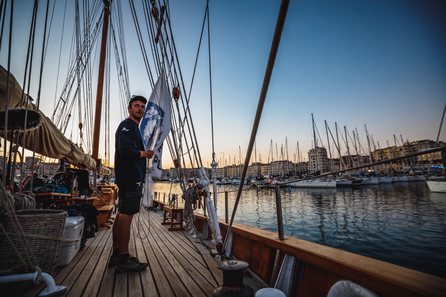 The Don du Vent had several lives and names (Nordstrand and Fatima) before becoming in 1979 one of the prestigious old rigs moored at the Quai d'Honneur of the Vieux-Port (Old Port) of Marseille. This auric ketch with an overall length of 98 ft (30 m) was built by the German Navy in 1947. It is a two-master sailboat with trapezoidal mainsails which has been used indistinctly for mine clearance, coastal surveillance, fishing, and human and material transport by the German Navy. The Don du Vent was later part of the dolce vita of the Côte d'Azur and its festivals in the 1960s and 1970s.