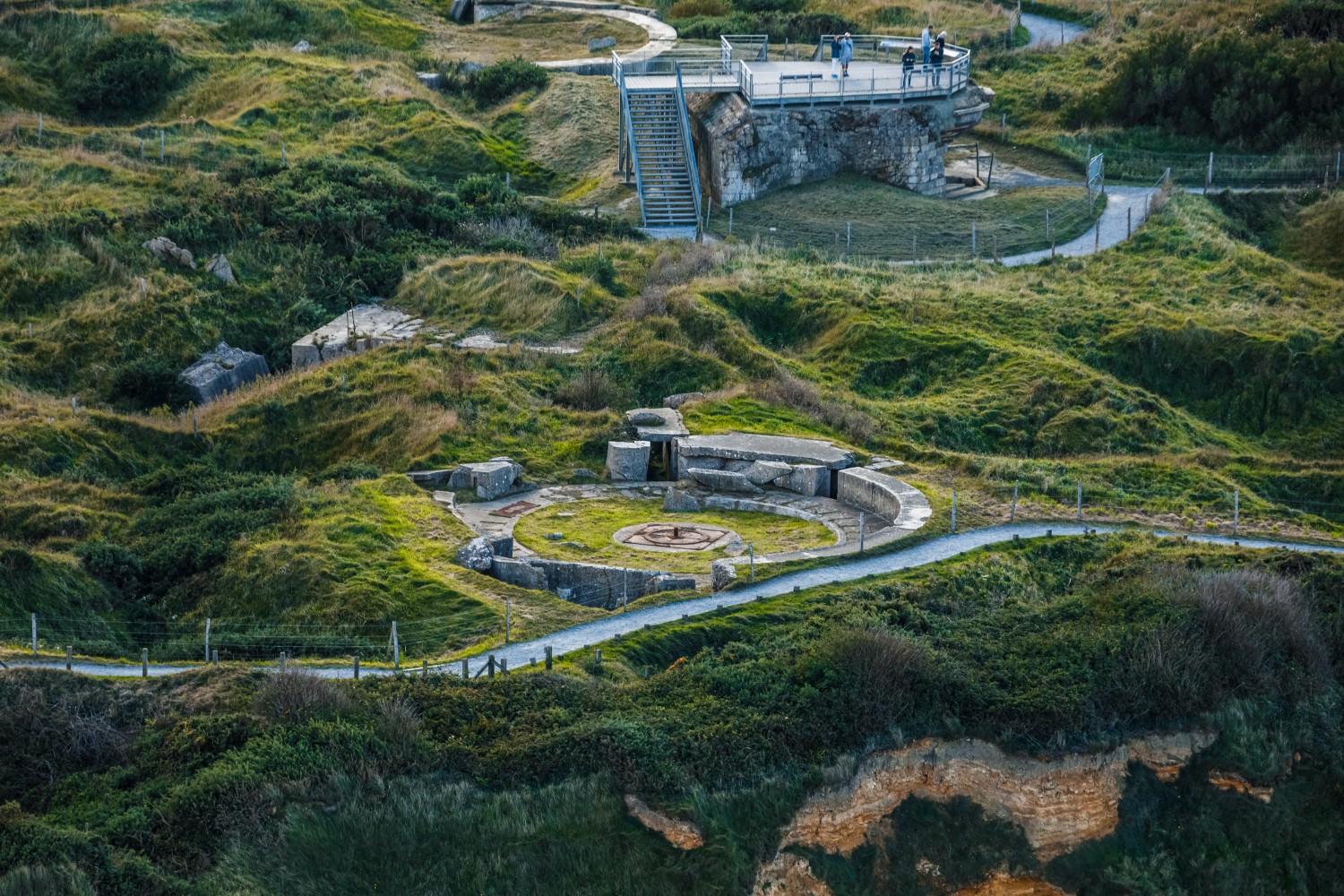 Directly above the Pointe du Hoc, a path runs through bombshell holes and the remains of German blockhouses. The 225 US Rangers sent there on June 6, 1944, were supposed to destroy artillery batteries. When they finally managed to climb the cliffs, the German soldiers had fled, and the concrete casemates were lined with wooden posts imitating cannons. They were positioned a few miles behind and pounded the Rangers forced to wait for reinforcements for three days.