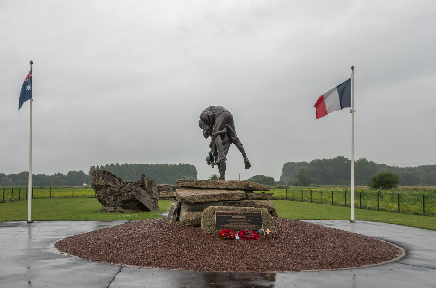 Le Mémorial australien de Fromelles (Fromelles Australian Memorial Park) inauguré le 5 juillet 1998. La statue réalisée par Peter Corlett représente le sergent Simon Fraser portant un camarade blessé.