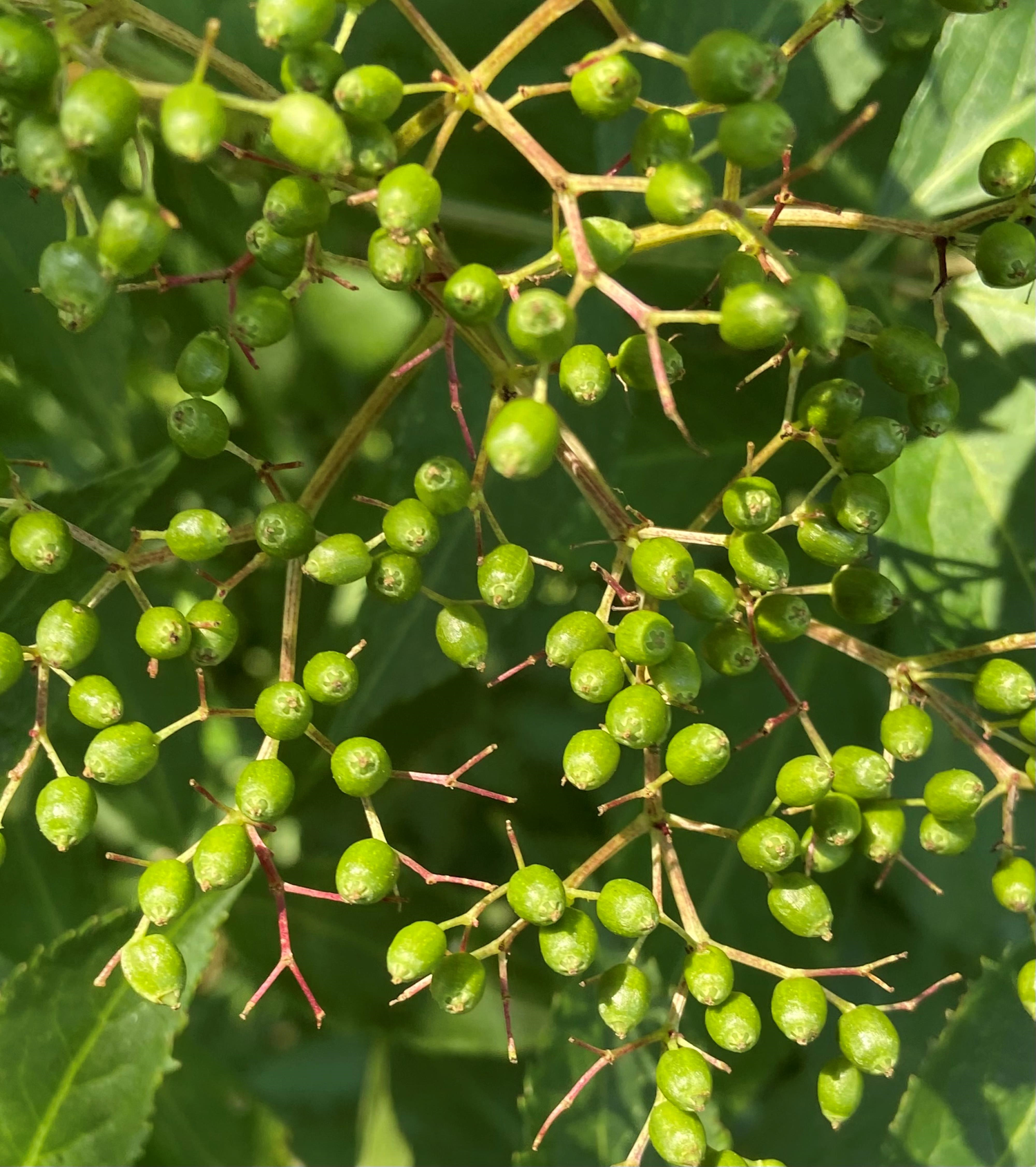 Après sa floraison parfumée en début d’été , le Sureau noir donne place à de multiples petits fruits verts, qui deviendront, à l’automne, des baies violacées comestibles disposées en grappes.