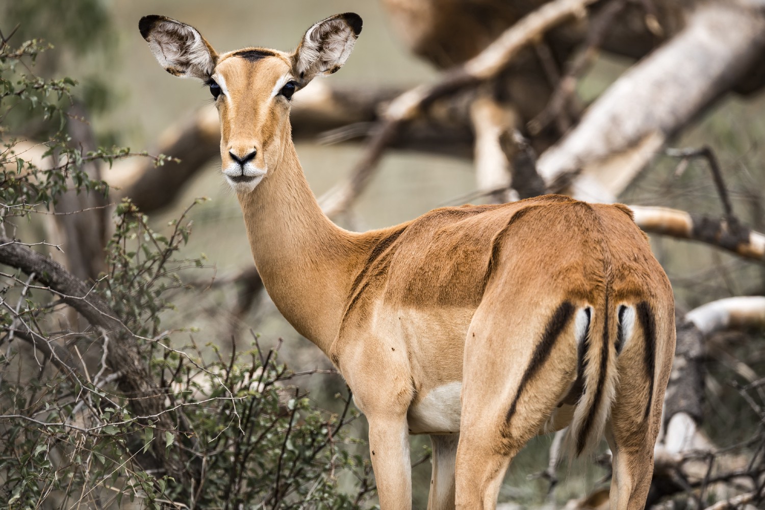 The three black lines of the thighs and the tail visible when the impala shows its back are at the origin of its different nicknames. Some trackers in Africa see a number and call it 111, others see a M shaped logo, like a famous burgers chain, and call it predators' fast-food.