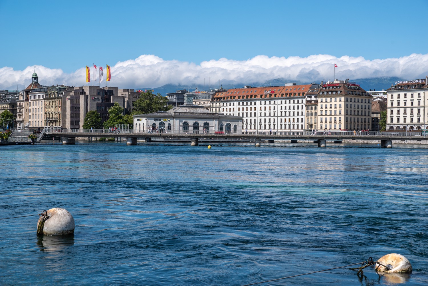 Le lac Léman, le Rhône, le pont du Mont-Blanc et le bâtiment historique de l'Arcade des arts.