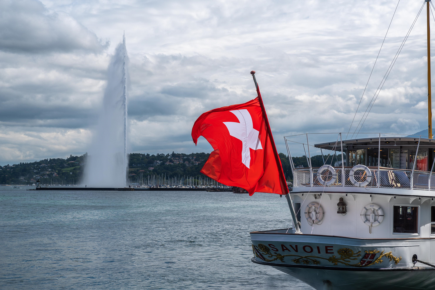 Le jet d'eau (140 m) sur le lac Léman et un bateau à aubes le long des quais.