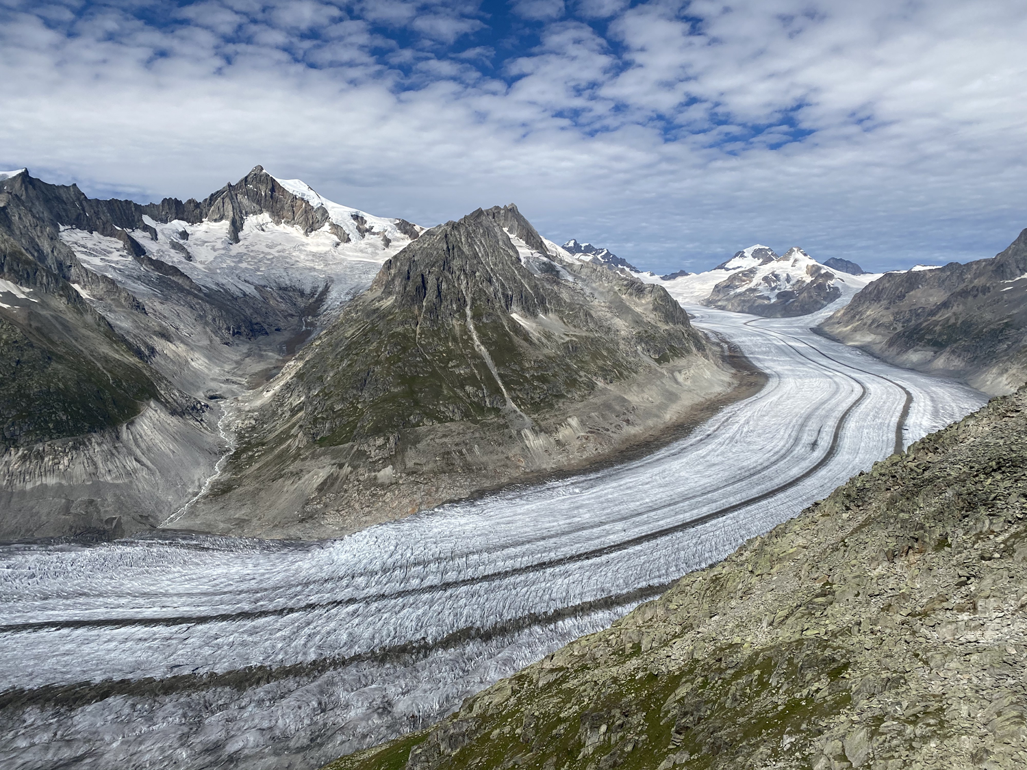 View of the river of ice from Eggishornn. Aletsch is the biggest glacier of the Alps, made of 27 billion tons of ice.