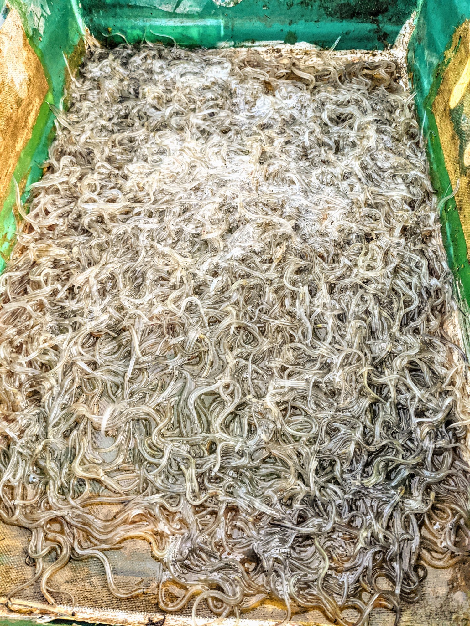 8kg of juvenile European eels that have swam into the Severn estuary, all the way from the Sargasso sea. These guys were transported past manmade barriers to safe upstream habitats to love and grow.