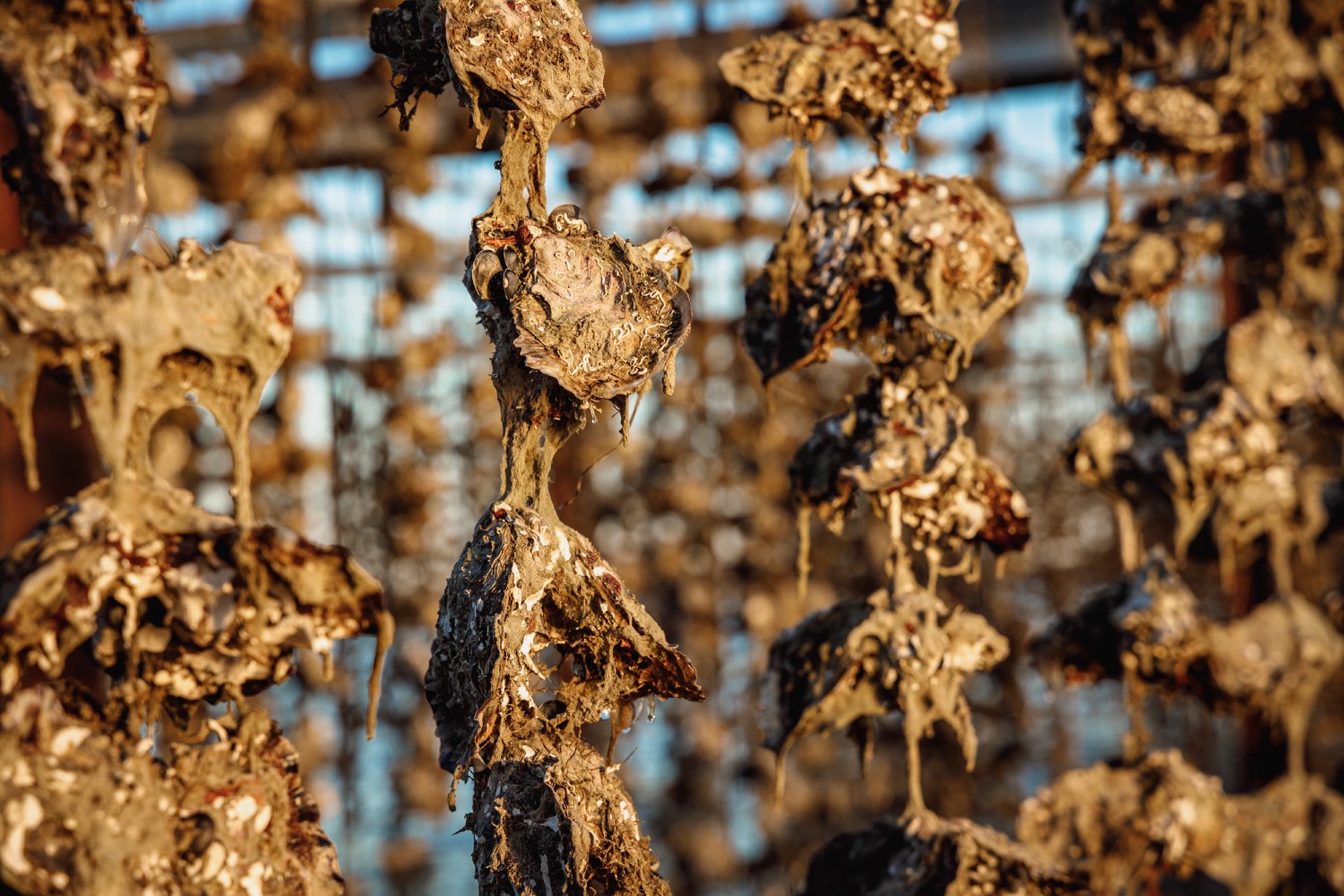 Shellfish farming in the Mediterranean differs from others by the absence of tide. The oysters are raised in nurseries and glued every 3,15 inches (8 cm) by 3 or 4 on ropes 10 to 16 ft (3 to 5 m) long. Wooden and metal poles, called oyster tables, support the ropes. The oysters will remain submerged for an average of one year compared to three in the Atlantic because of the organic richness of the lagoon. When they reach maturity, they are detached, washed, and placed for another three weeks in bags to perfect their flesh content.
