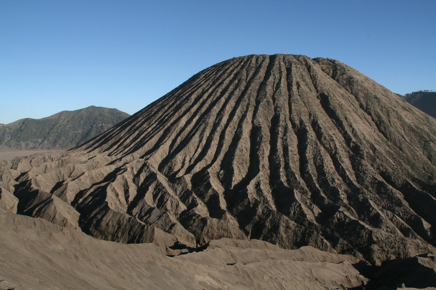 Le flanc du mont Batok, situé en Indonésie sur l’Ile de Java, est un cône de scories (ou cône de cendres) formé par l’empilement d’ejectas.