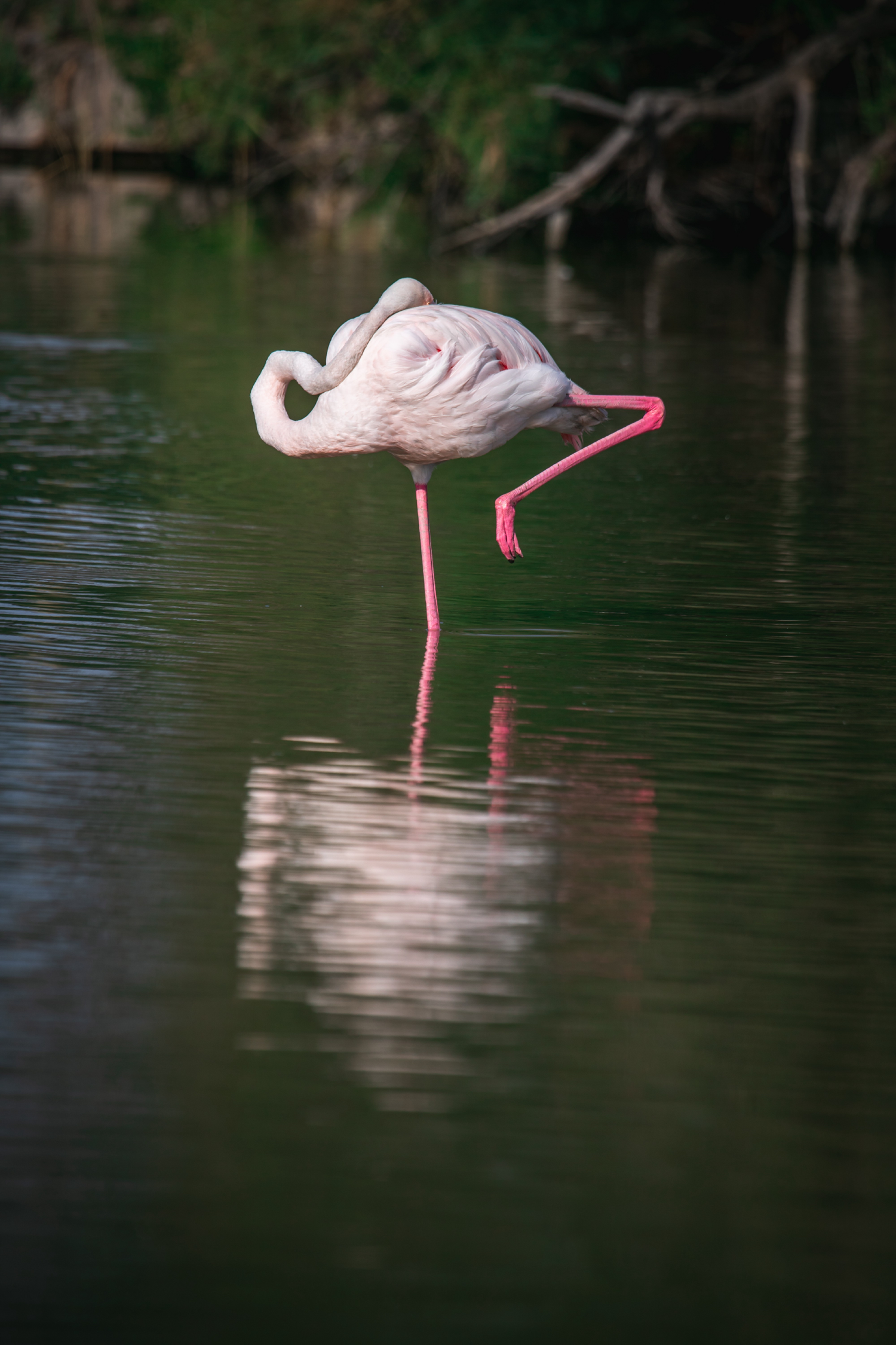 The greater flamingo (Phoenicopterus roseus) stands upright by folding its long, featherless leg to conserve as much heat as possible. It thus minimizes heat exchanges, especially when it is in water. The flamingos, therefore, less often sleep on one leg when the air temperature is high, and fewer flamingos do so on land than in water. However, lying down to sleep would make them more vulnerable to predators.