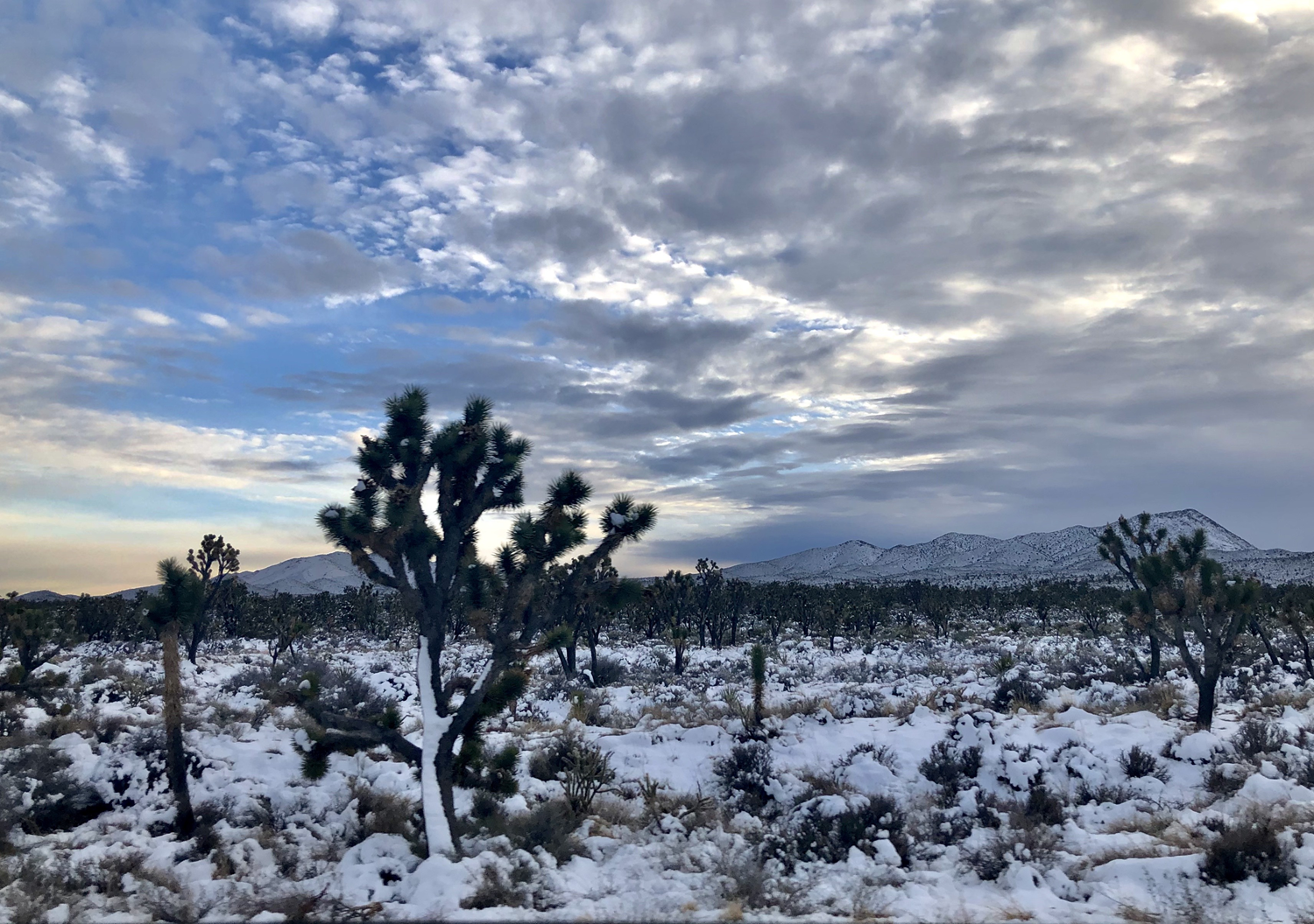 Snowfall in the mountain pass outside of Baker, CA. A layer of powder coats the joshua trees and mountains.