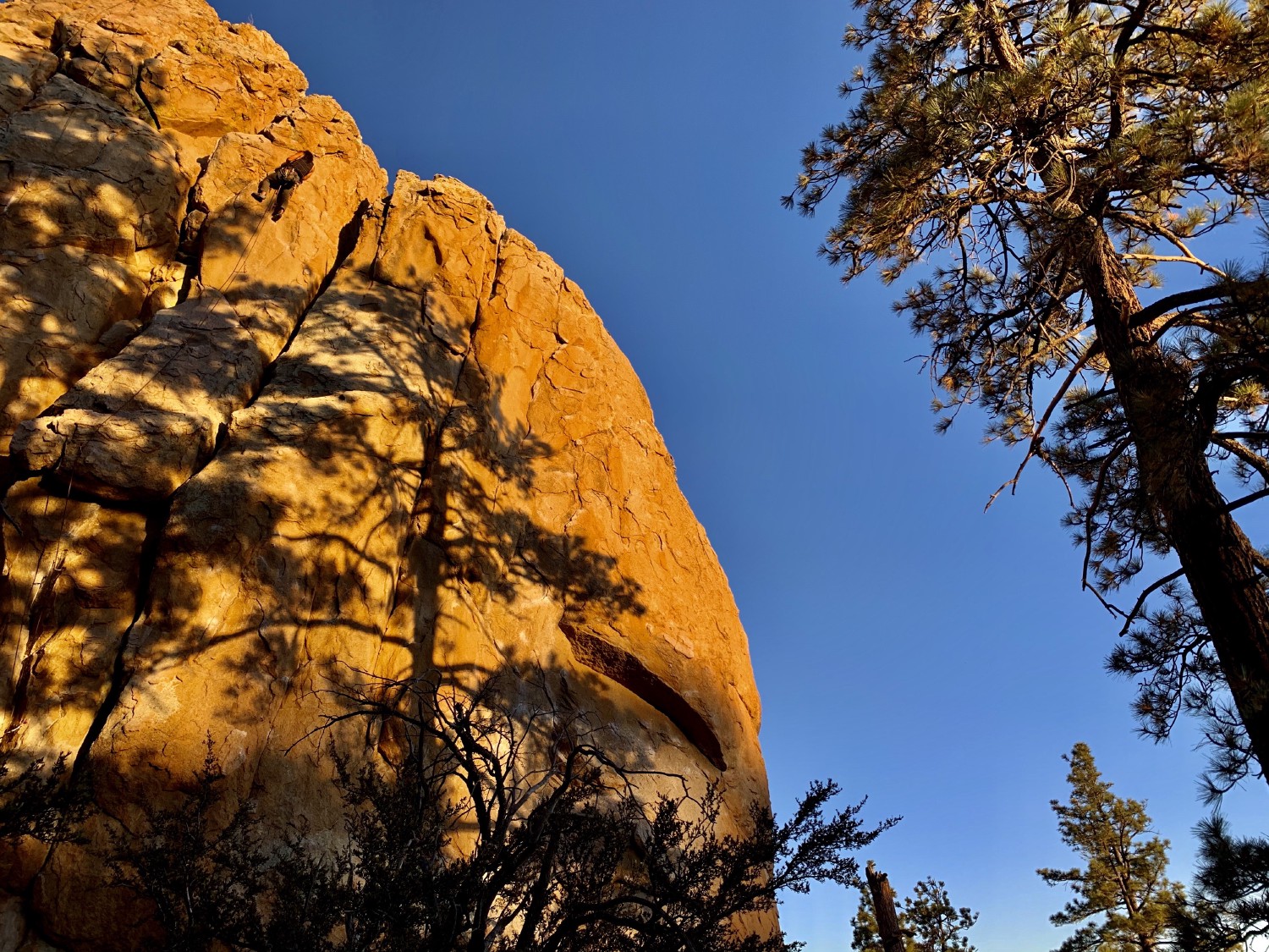 Shadows from the towering pines being cast by the golden hour sun onto the pinnacles of Holcomb Valley