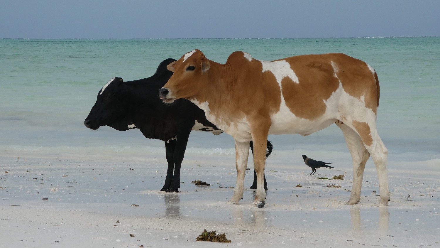 Two humped zebu cattle (Bos Primigenius Indicus) are standing on the beach of Paje in Zanzibar.