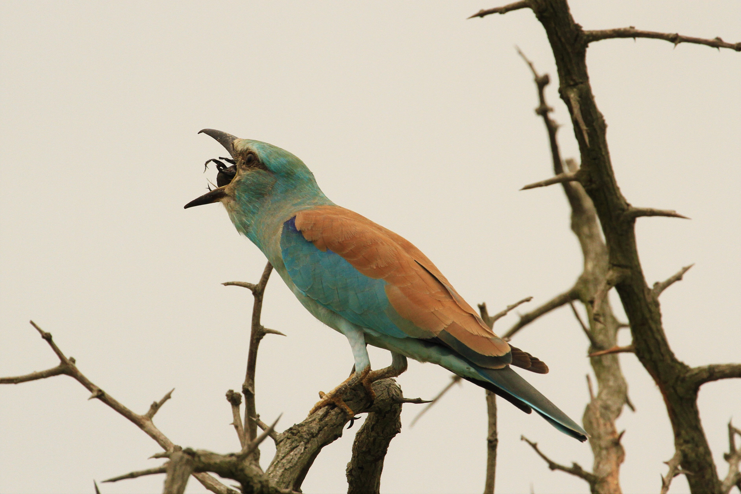 This European Roller was trying to swallow this large beetle in one piece. Its eyes were larger than its stomach as the beetle simply did not fit. Despite several attempts of swallowing its meal the bird eventually flew away with it. We don’t know if it succeeded!