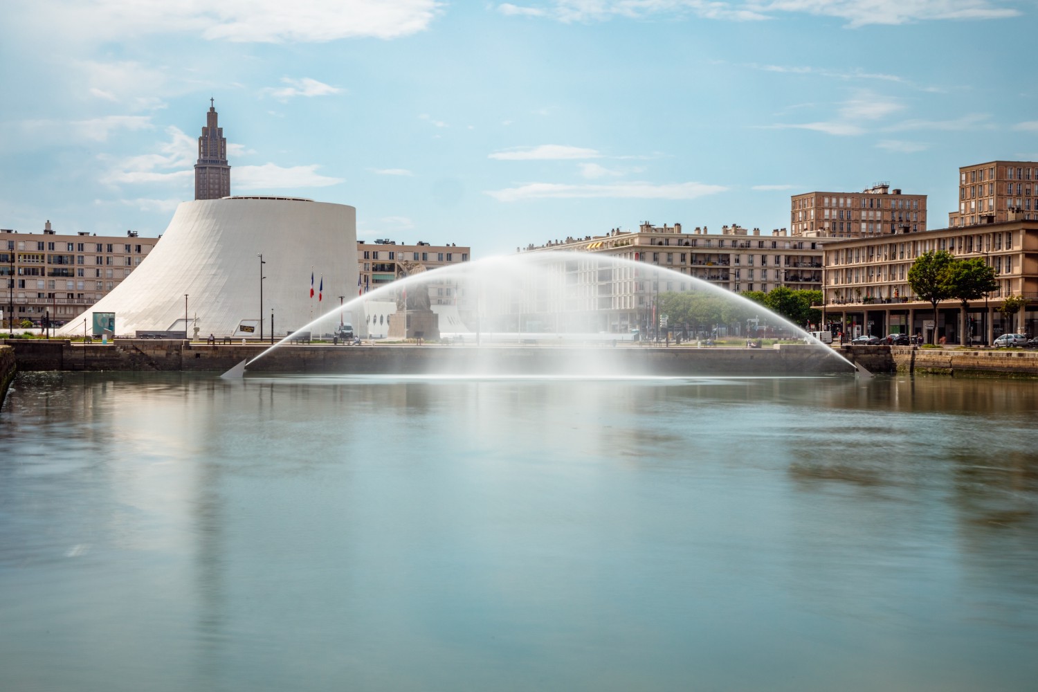 Since May 27, 2017, Le Havre in the Seine-Maritime department has welcomed a work of art from the artist Stéphane Thidet. In the city's Bassin du Commerce, immense jets meet to form Impact, a water sculpture representing the elements that interact with the territory of Le Havre. The fountain originates from two modules installed in the basin about 132 ft (60 m) apart that project colliding jets of water. Its temporary and brief occurrence creates specters of light on the basin.