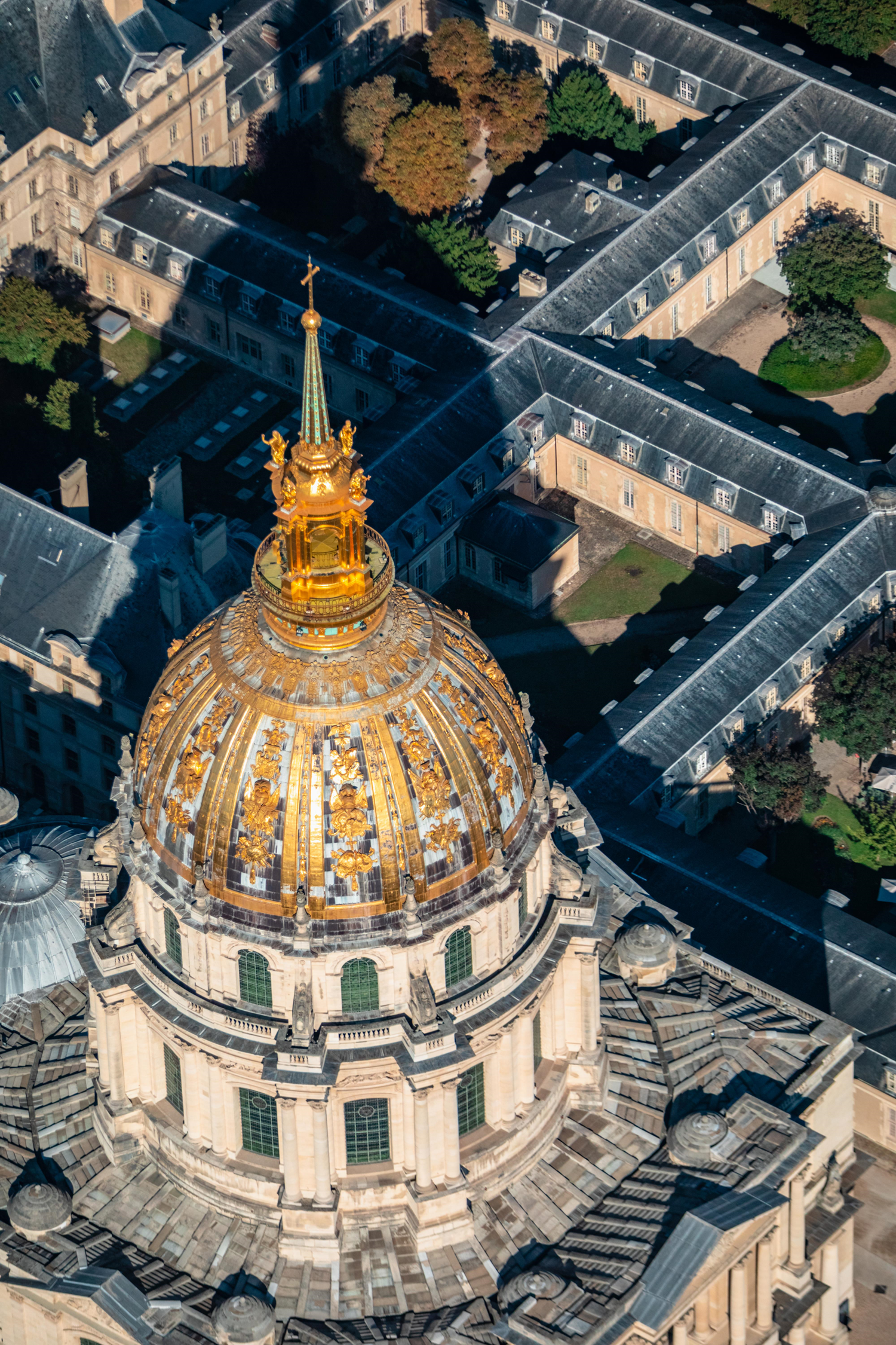The Dôme des Invalides church is crowned with a dome 101 metres high and 26 metres in diameter, the construction of which was completed in 1706. On 28 August 1708, the architect Jules Hardouin-Mansart handed over the key to the church to Louis XIV who expressed great satisfaction. The highest building in Paris until the construction of the Eiffel Tower for the 1889 World Fair, the dome is dominated by a gilded square lantern and a fleur-de-lys spire ending in a cross. The lead-covered roof is divided into twelve gilded compartments decorated with military trophies in relief, in which skylights are concealed.