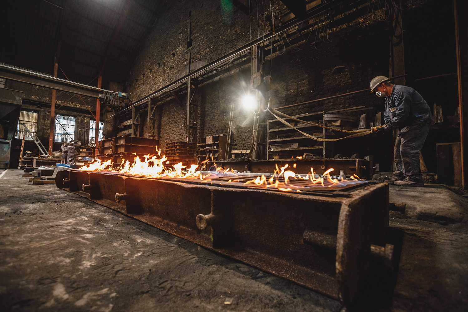 In metallurgy, cast iron describes an iron alloy containing 2.1 to 6.67% of carbon. The steelmakers at GHM, in the Haute-Marne department, also often work with cast aluminum and bronze alloys. They carry the molten metal at 2,550° F (1,400° C) in pockets called ladles and pour it into the mold through a cavity. When overflowing, the liquid mass stops as the vent is turned on to evacuate the gases. Techniques have hardly changed since the 19th century.