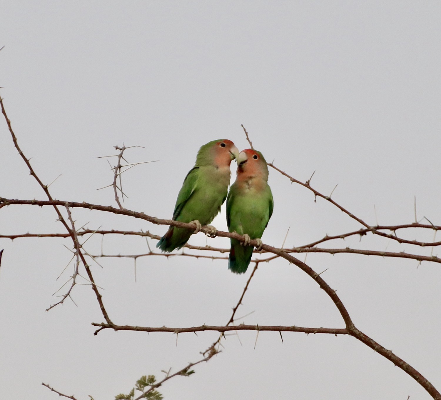 El Inseparable de Namibia tienen un tamaño de unos 15 cm. El color del cuerpo es, en general, verde. Tienen la cabeza de color rosa asalmonado. La hembra se diferencia del macho en que tiene la cabeza más grande, y sus colores suelen ser más pálidos. Aun así, es muy difícil diferenciar ambos sexos. Durante el periodo de reproducción, las hembras de esta especie se distinguen por su comportamiento: solo las hembras se colocan entre las plumas del obispillo el material que llevan para construir el nido: hojas de palmera, ramitas, etc