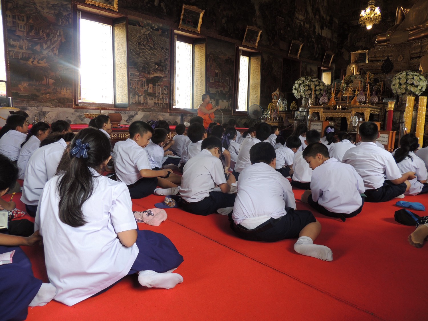 Intervention, devant un jeune public, d'un moine bouddhiste dans Le Wat Arun