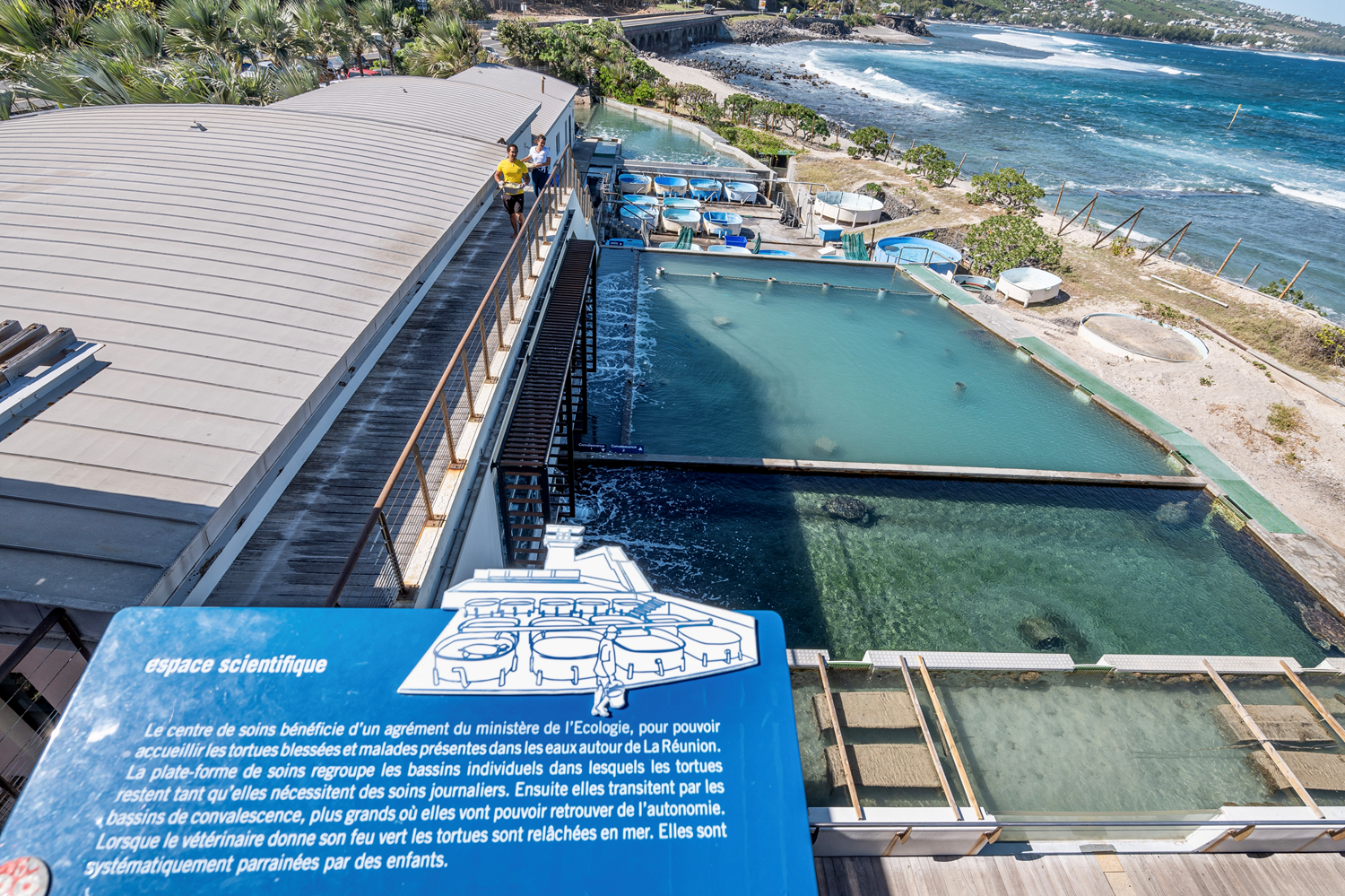 Bassin de soin des tortues. Celles ci sont pesées, alimentées et surveillées quotidiennement par plusieurs soigneurs