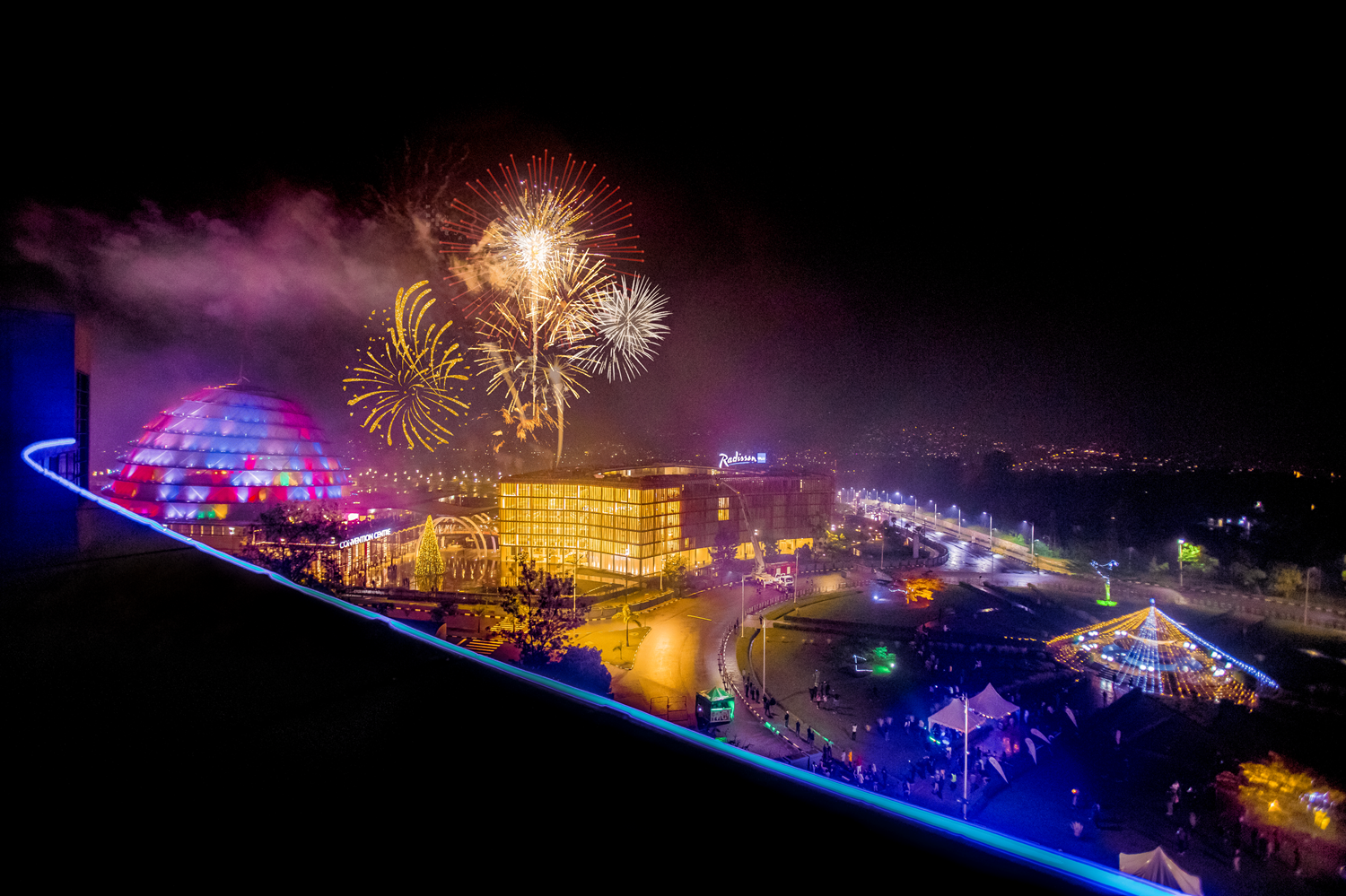 Fireworks being released on the top of Radisson Blu hotel next to Kigali Convention Center on the New year eve of 2018