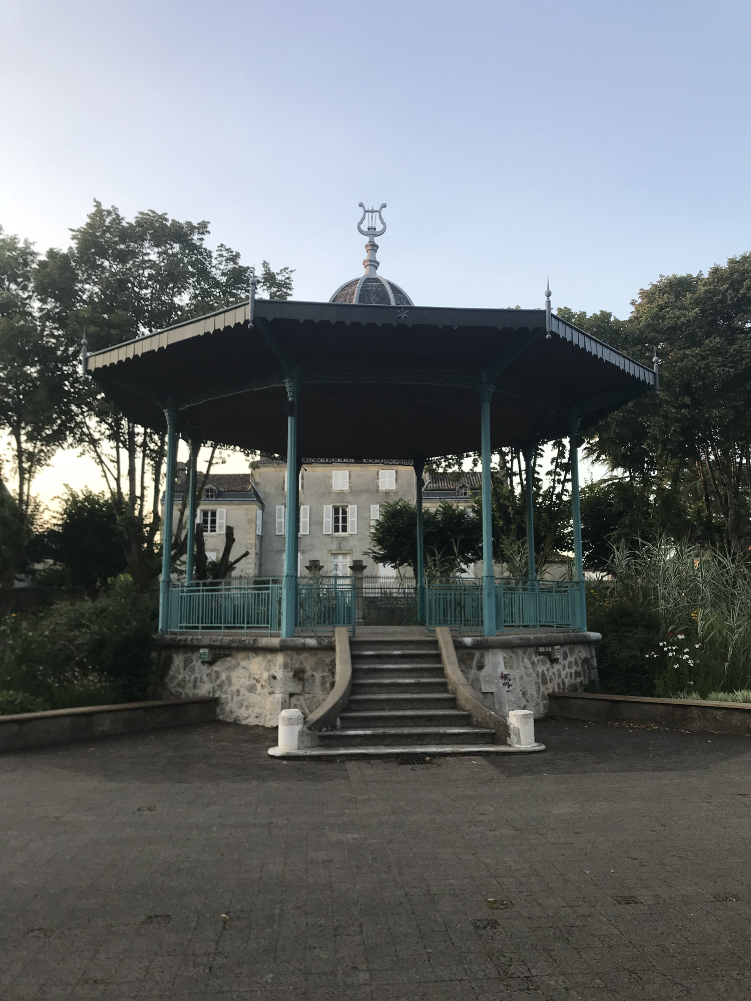 Le kiosque à musique métallique du style Art Déco, construit en 1930 sur la place Bugeault à Melle.