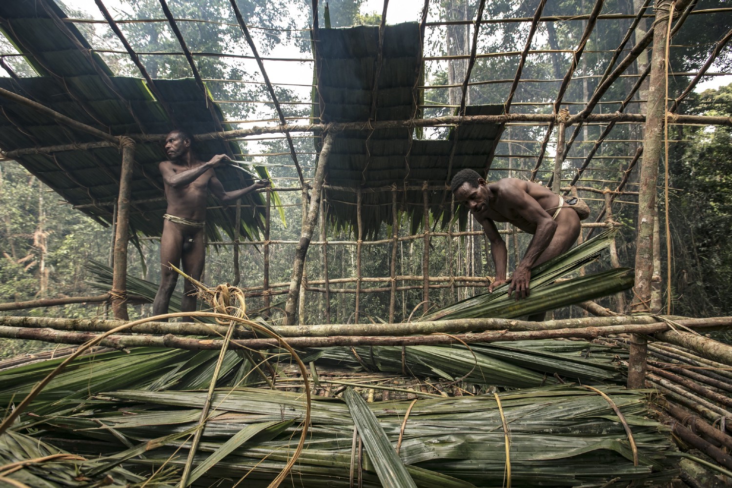 Korowai houses are built of wood, bamboo and leaves at the top of vigorous trees (Banyan or Wanbom) at an average height of 26 to 39ft (8-12m) to escape mosquitoes and other predators. Their floor is composed of logs covered with sago bark and their walls are made of bark or braided foliage. Their roof is covered with palms. Built within 1 or 2 days, the houses grouped in clearings last 3 to 5 years and are abandoned when the surrounding forest no longer supports the families who inhabit them.
