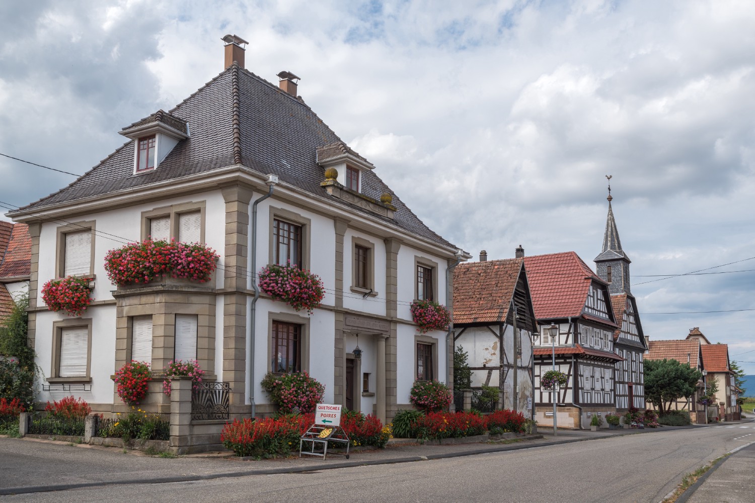 Eglise protestante et maison à colombages. Kuhlendorf est un ancien village, rattaché à Betschdorf en 1972.