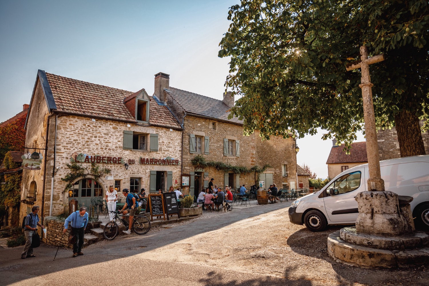 The 'Auberge du Marronnier', in the center of this photo, reminds us that the village of Châteauneuf-en-Auxois has a long tradition of hospitality since it was a stopover on one of the many paths taken by pilgrims to get to Santiago de Compostela. A shield with three shells placed above the door of a house also testifies to this. As for the mission crosses, the village has several, notably below the church and next to the funeral monument.