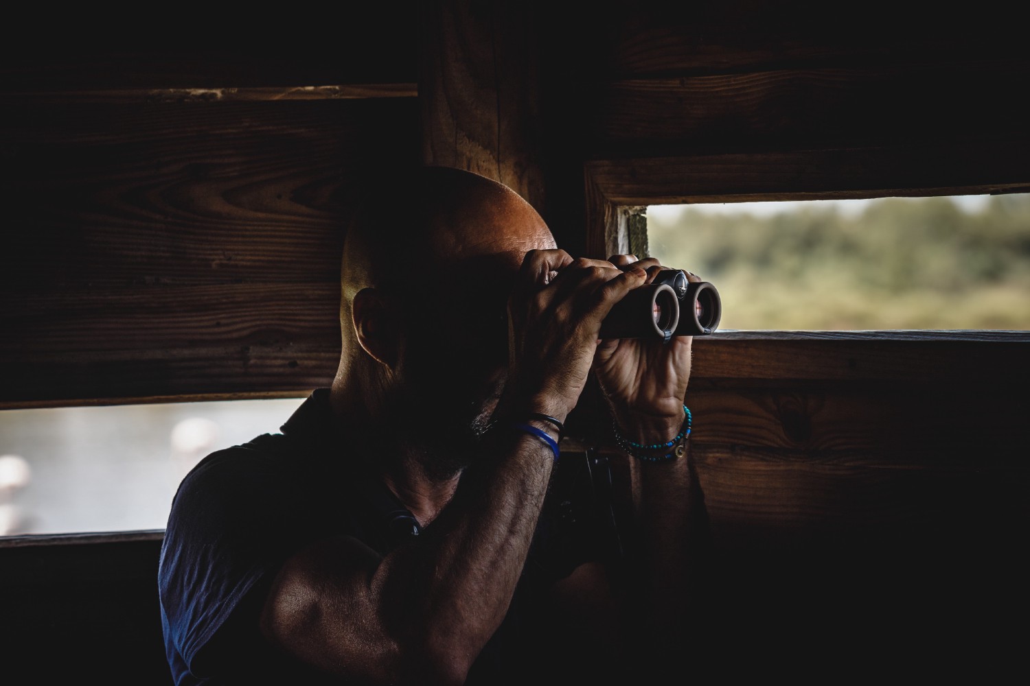 Particularly handy and easily transportable, binoculars are the ornithologist's basic equipment for observing birds within a hundred meters radius (330 ft). Unlike the spotting scope, they give the ornithologist an adequate width of field that allows him to easily and instantly find and frame his target, even in movement. Used outdoors in contrasting climatic conditions and diverse and often humid environments, binoculars must - beyond their optical magnification, brightness, and minimum focus performances - present robustness, waterproofness, and lightness qualities.