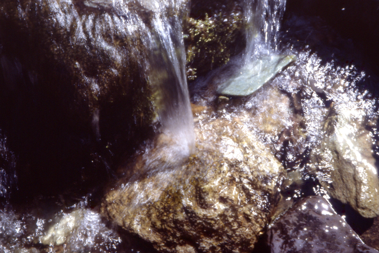Small mountain stream bouncing on stones of all colors, at 2000 meters, near La Croix-de-Fer pass, Saint Sorlin d'Arves, in the Alps, France.