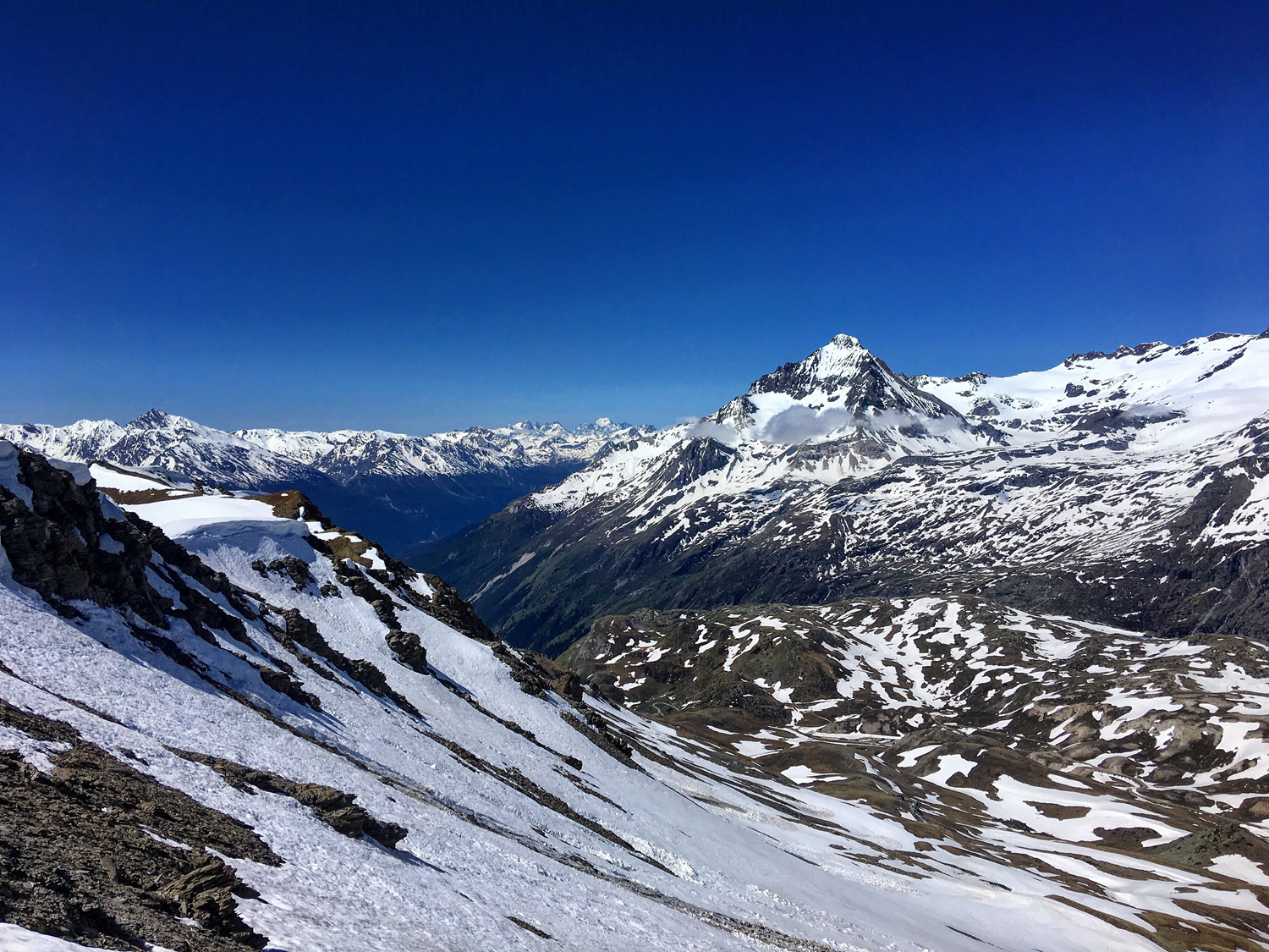 Vue sur la dent Parrachée (3697m) et la vallée en descendant de la pointe de Lanserlia (2909m) lors d’une belle journée de juin.