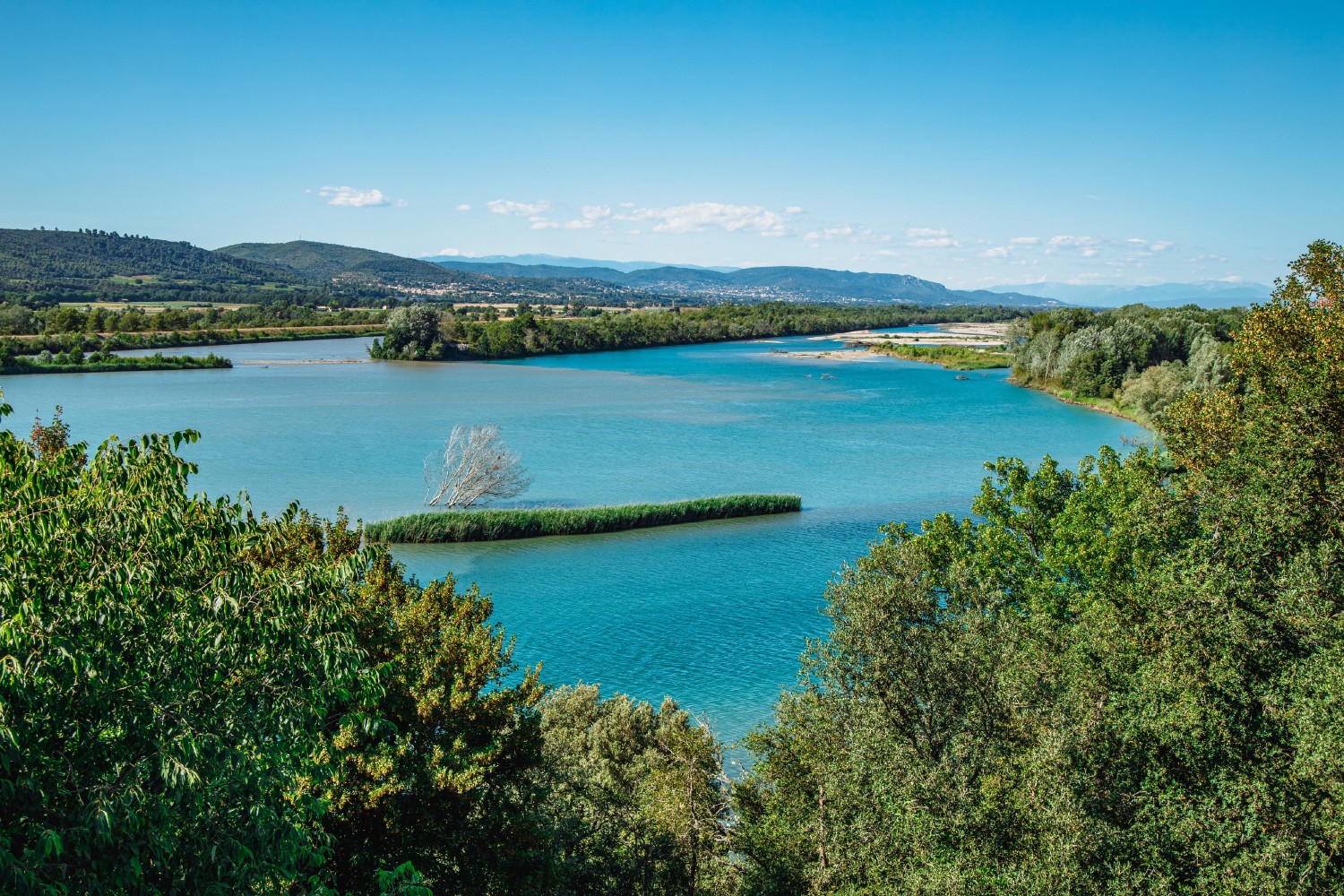 The Durance river travels 189 miles (305 km) between its source south of Montgenèvre at an altitude of 7,841 ft (2,390 m) and its confluence with the Rhône. The watercourse owes its originality to its slope, which remains relatively high even in the lower section of the river and partially contributes to its torrential character. The difference in level of the Durance indeed reaches 6,856 ft (2,090 m) between its source and its confluence with the Rhône. In its middle and lower part, its course widens and it flows in an alluvial plain that can reach several kilometers in width.