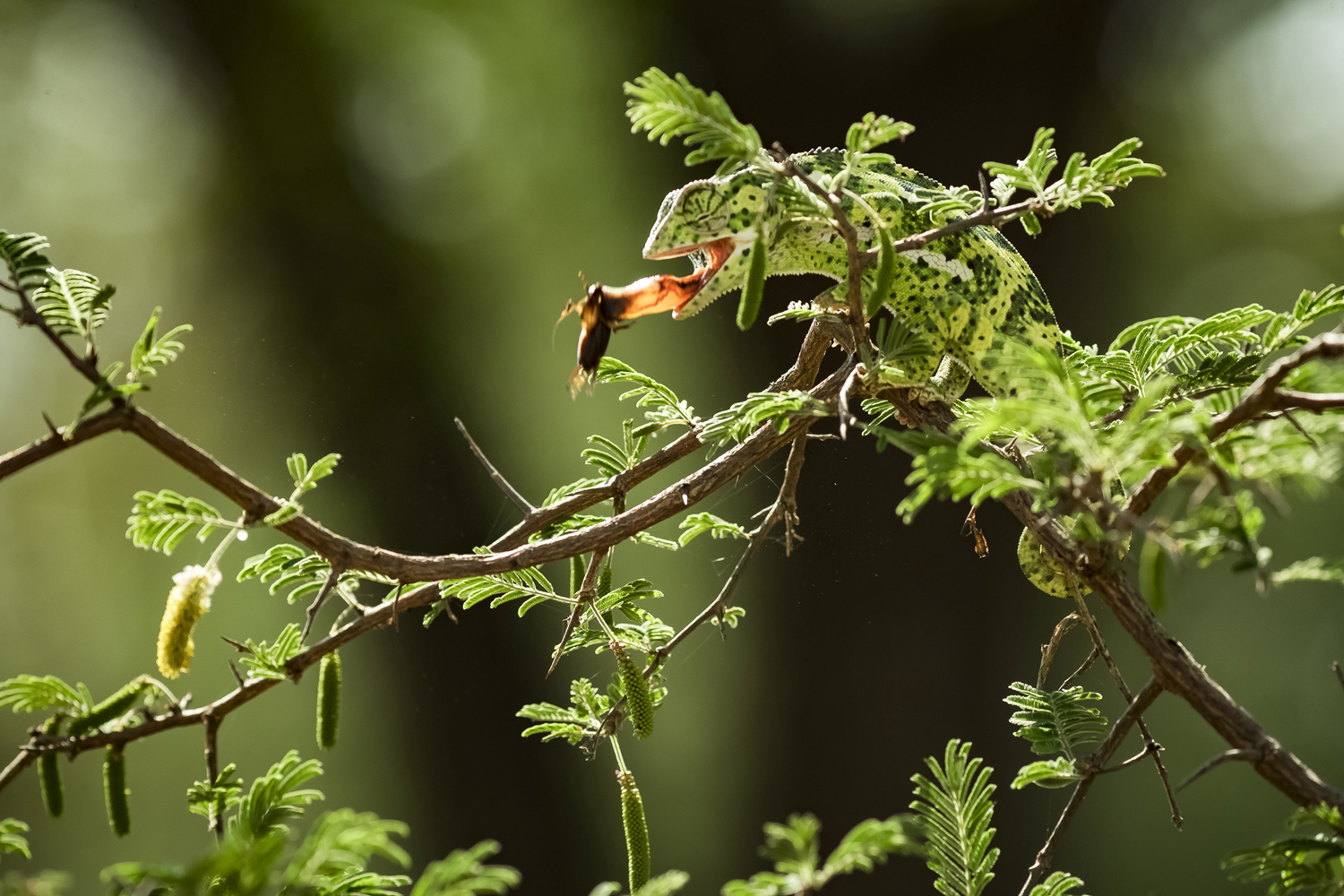 This flap-necked chameleon has just caught its prey. As soon as the chameleon has spotted its prey, it captures it with its long tongue. Its tongue, which can be propelled at a distance equal to its own length, is presented as a long tube terminated by a viscous bulb.