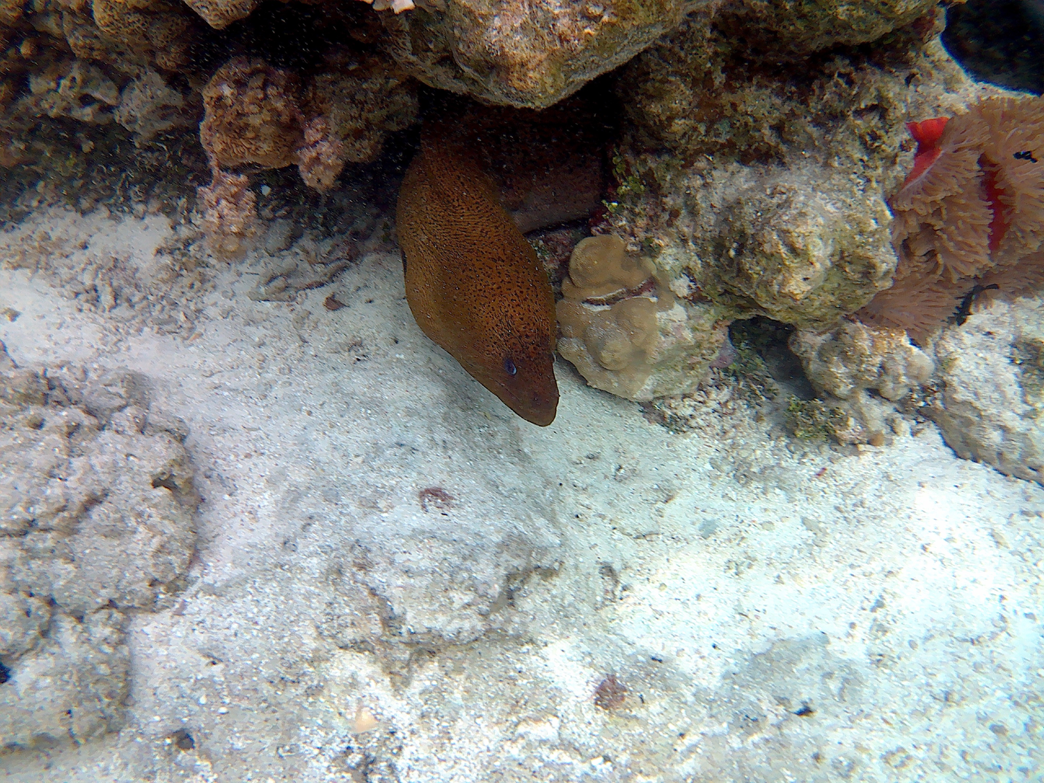 La murène géante ou puhi en tahitien, est la murène la plus massive des eaux polynésiennes. Elle est également un prédateur redoutable possédant une rangée de longues dents pointues, de véritables rasoirs affûtés.