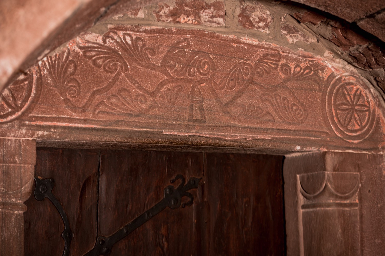 In 2020, the solemn opening of the small door leading to the tomb of Saint Odile marked the beginning of the Mont's Great Jubilee. The celebrations occurred exactly 1,300 years after the death of the patroness saint of Alsace. The door stands between the Chapel of the Cross and the Chapel of the Tomb. The Romanesque floral decorations engraved on its lintel are the oldest in the sanctuary. They date from the 10th century. The rosettes on each side symbolize purity, love, and light.