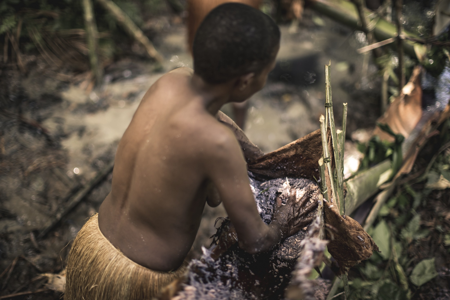 This Korowai woman is preparing 'sago bread', a food starch extracted from the pulp of the sago trunk. The collecting of sago, the Papuans' staple food, mobilizes the entire community : the men fell and debark the palm tree, then the women crush it until they reach the core fibers which they reduce to a pulp, filter and decant to consume them boiled or cooked on the fire in the form of flat bread. A tree can feed two to three families for a week.