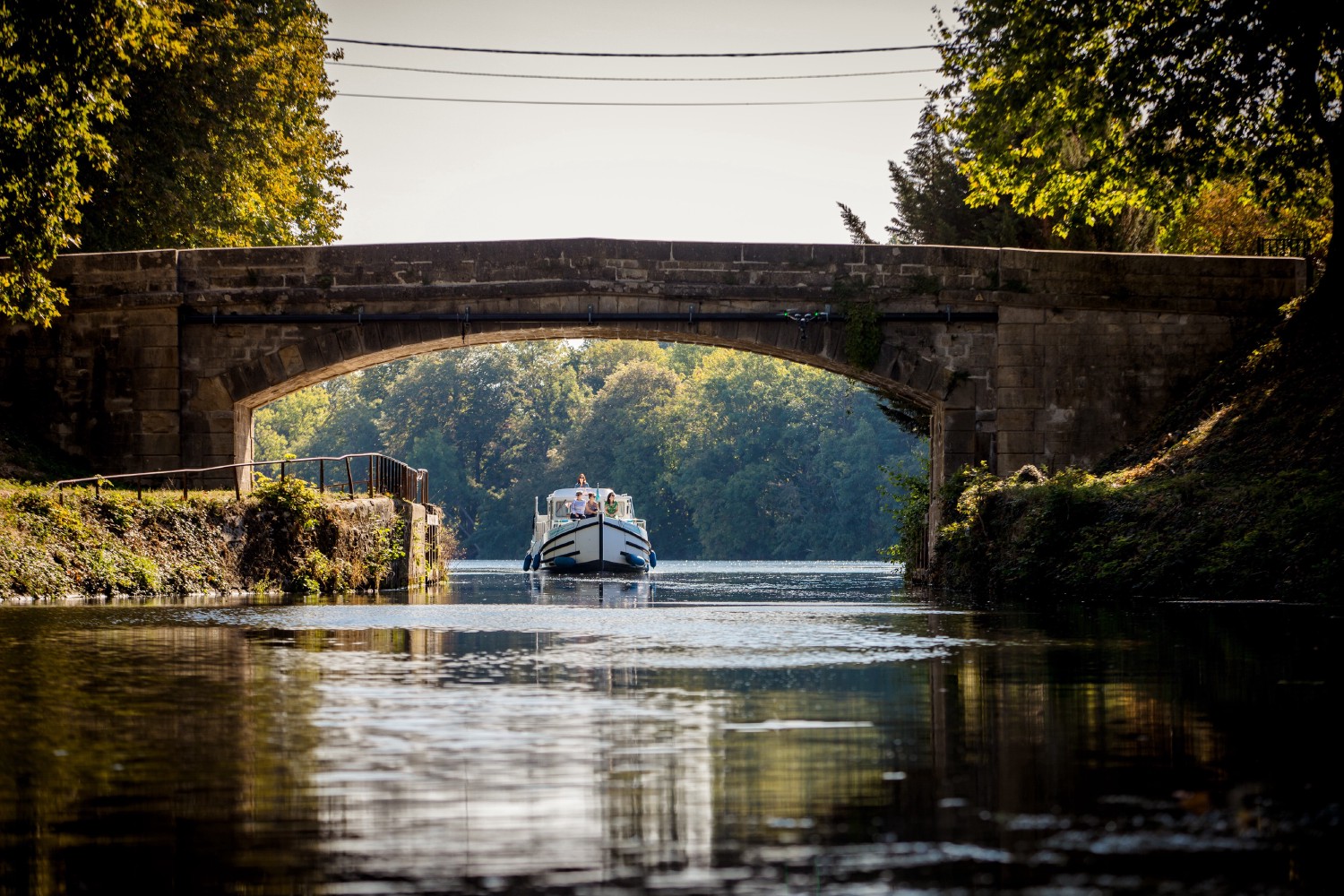 The River Yonne, its canals, and its small stone bridges, such as this one of Epizy, invite to a river ride. In these landscapes of Champagne Crayeuse, the trees on each side of the riverbanks form narrow corridors. On a sunny summer day in Burgundy, the banks are discovered on small rented barges. The secrets of the flora and fauna of the canals are quietly revealed to the visitors.