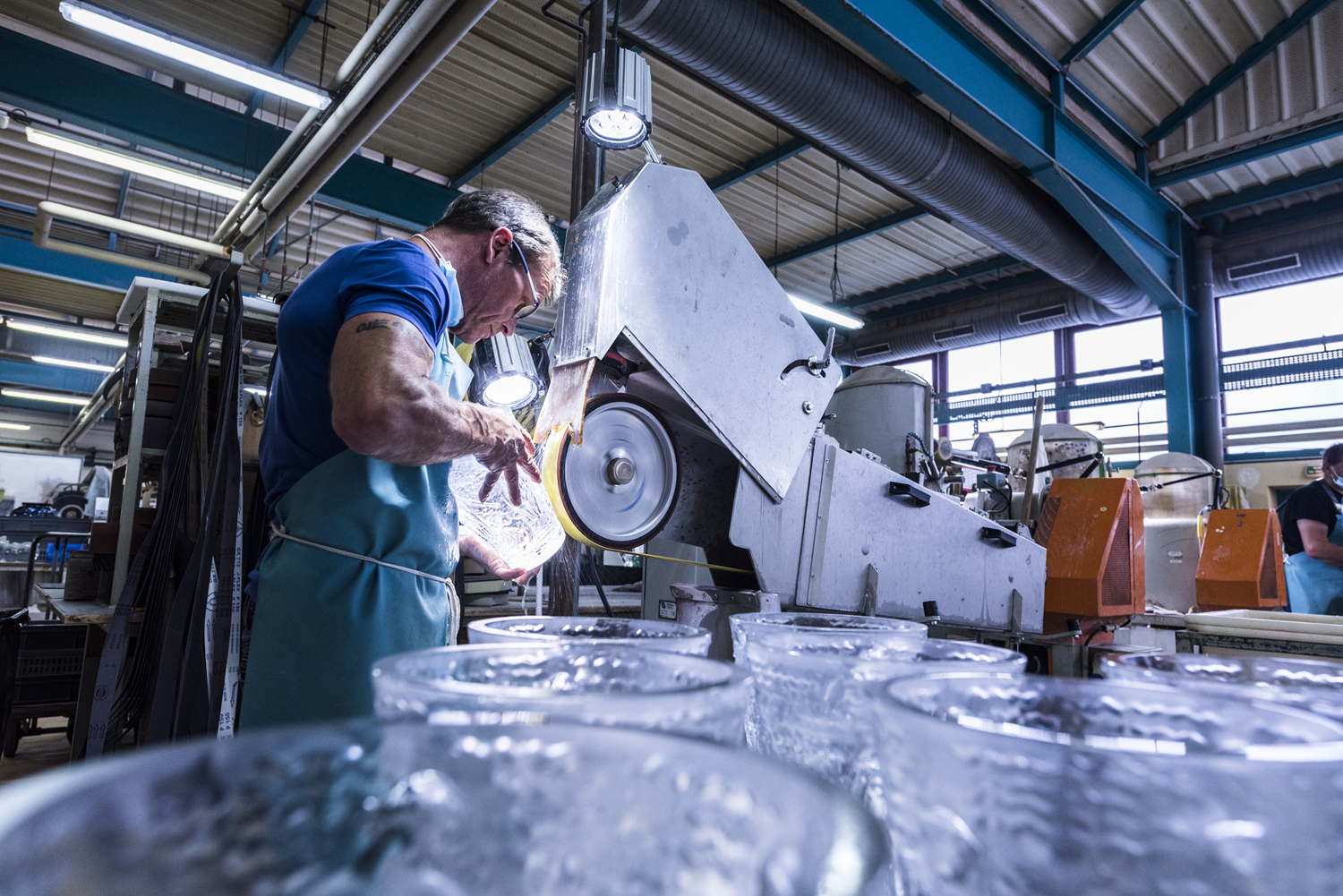 Polishing gives the crystal its full brilliance thanks to a polishing wheel. This operation is the opposite of sandblasting, which produces more opaque parts. René Lalique favoured the satin-polished finish, which allows certain parts of a glass object to be matted (by sandblasting or acid bath), and then the rest to be polished in order to reinforce the transparency and shine. After the shift from glass to crystal in the 1950s, satin-polished crystal is still the success of the Lalique glassworks, which is constantly guided by the search for beauty and perfection.