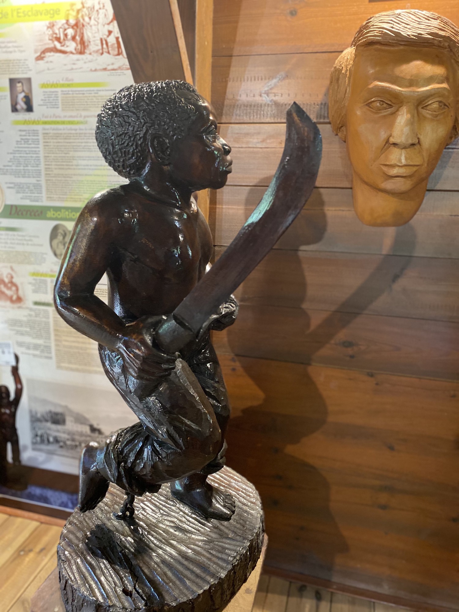 L'esclavage en Martinique expliqué dans ce village reconstitué par un martiniquais et représenté par cet enfant avec le coupe coupe de canne à sucre.