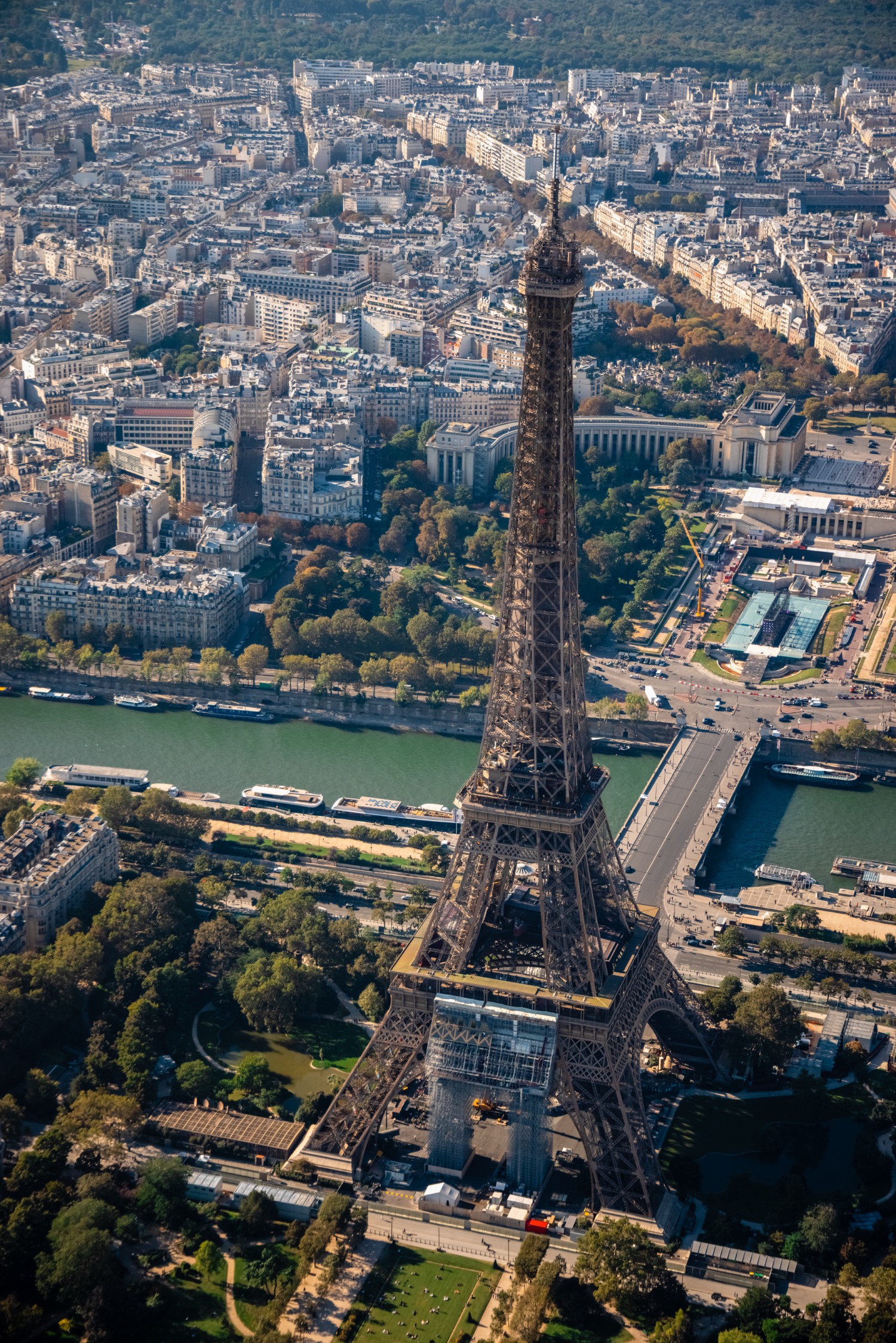 Since the end of 2018, the great arch of the Eiffel Tower has been partially hidden by a huge scaffolding. The Iron Lady is indeed getting a more extensive paint job than the regular seven-yearly paint jobs. Due to localized cracks in the heart of the nineteen previous coats of paint, this twentieth refreshment requires a total stripping of 82,020 sq. ft. or 25,000 m² (one tenth of the structure), or about thirty tons of paint. Once the iron is exposed, a new coat of the original yellow-brown paint is applied. This is an essential operation to protect the structure against weathering, rust and pollution.