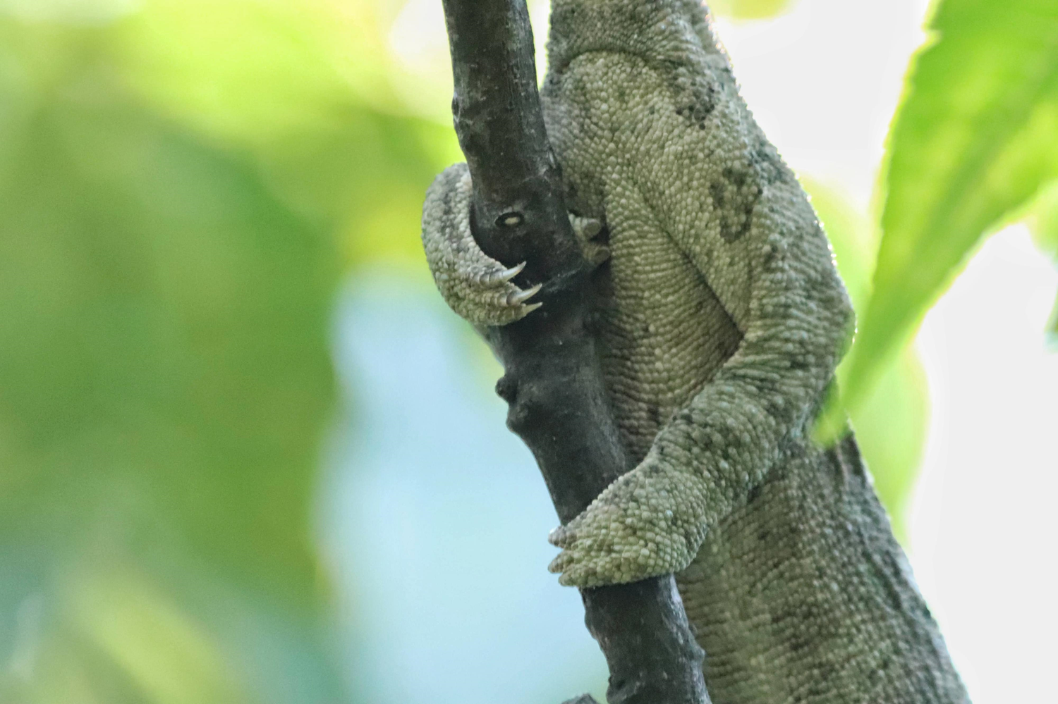Las patas del camaleón tienen cinco dedos prensiles: tres hacia fuera y dos hacia dentro. Su larga cola, que suelen tener enroscada en forma de espiral, se despliega y les sirve para agarrarse más fácilmente a las ramas de los árboles.