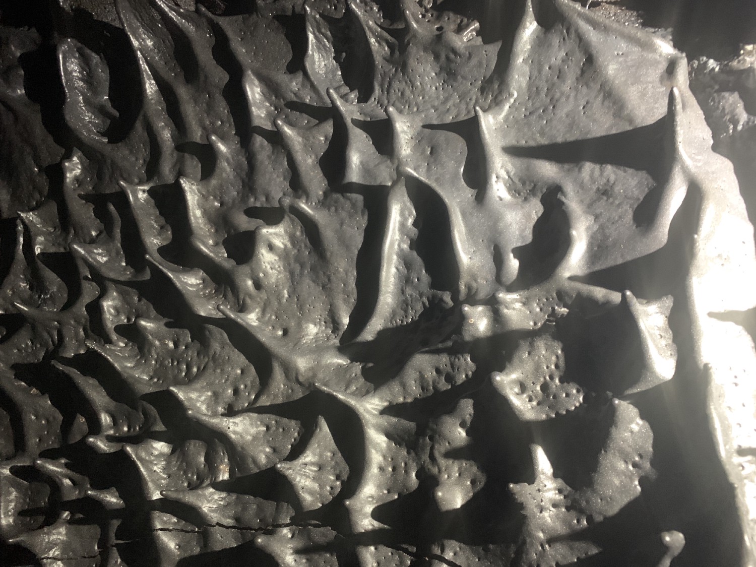 Inside a lava tunnel the wall and ceiling shapes are unique: sharp, a real black, and shallow. Lava tunnels are a natural conduct of flowing lava beneath the hardened surface of a lava flow.