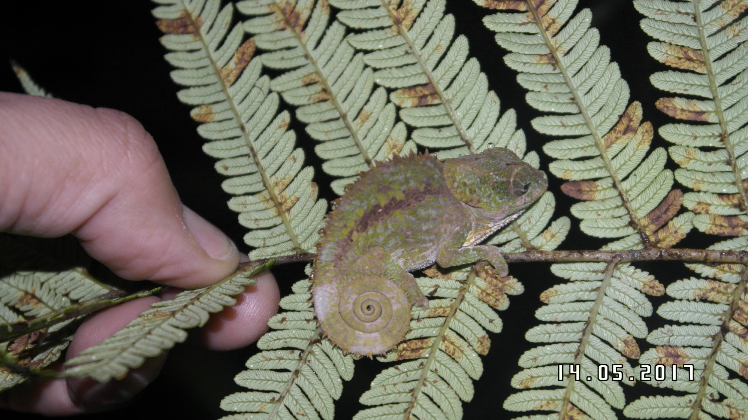 Voici le plus petit caméléon du monde. A comparer avec pouce. Immensément petit. Vu pas loin de la ville d'Andasibe