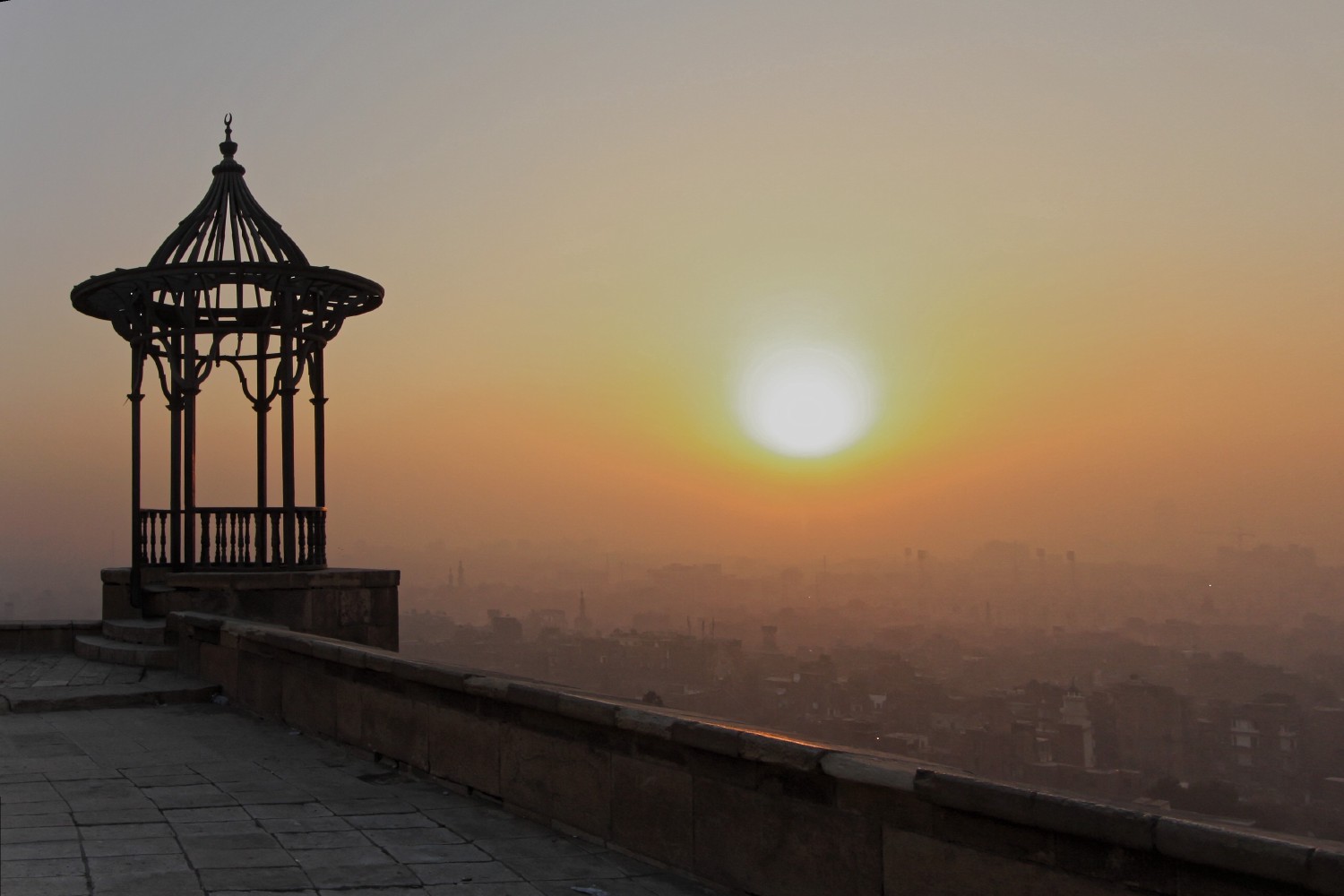 Superbe coucher de soleil sur Le Caire. Mais, Il ne faut pas se tromper, la brume est due à la pollution et non à l'humidité. En effet, Le Caire est la ville la plus polluée au monde. Le gouvernement Egyptien a mis en place un plan de diminution de la pollution de l'air pour réduire les particules en suspension.