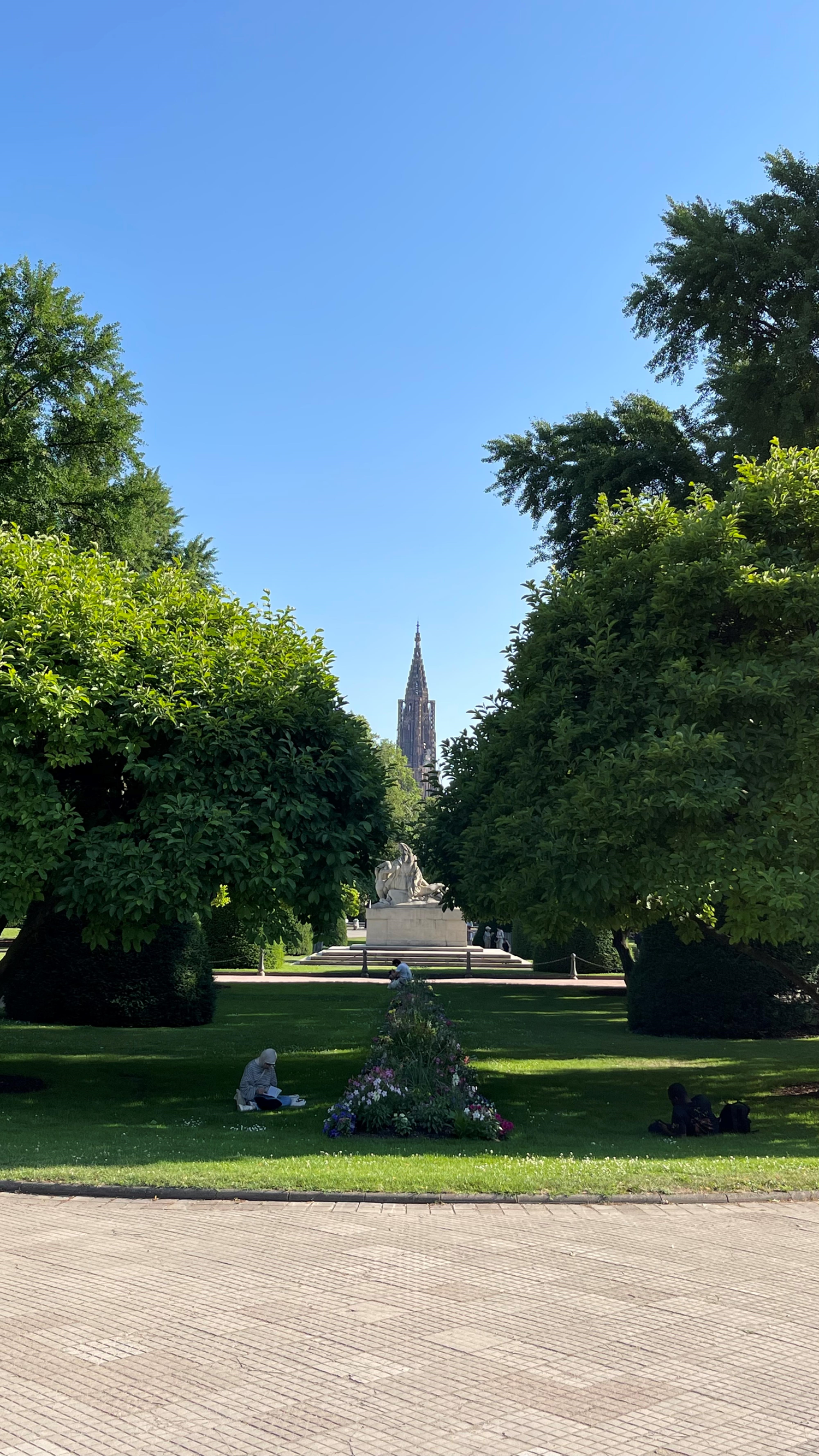 Le jardin central de la place de la République de Strasbourg ( Bas-Rhin ) avec le monument aux morts et la cathédrale en arrière-plan.